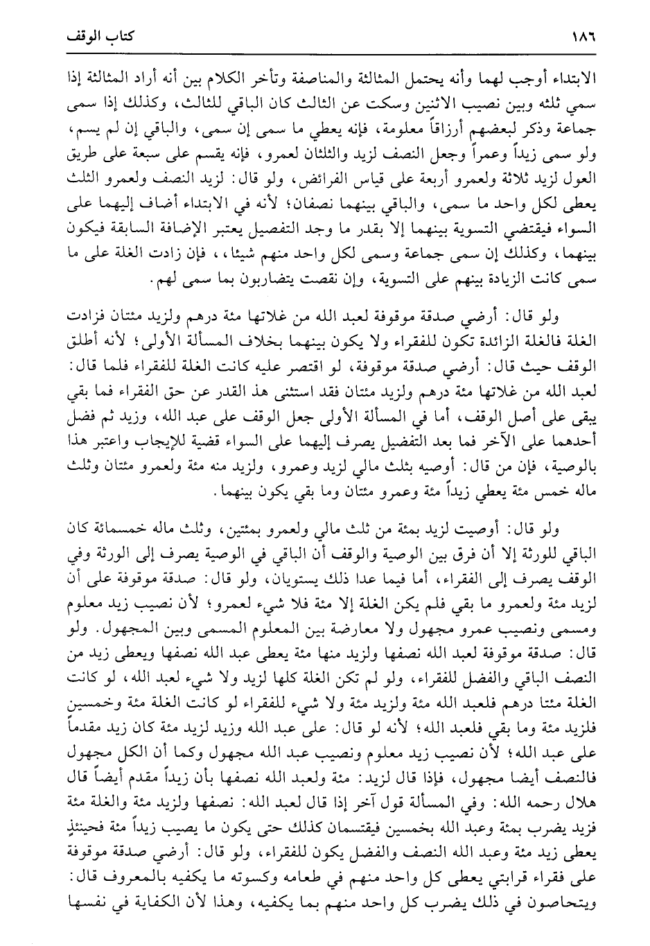 ولو قال: أوصيت لزيد بمئة من ثلث مالي ولعمرو بمئتين، وثلث ماله خمس مئة كان الباقي للورثة إلا أن فرق بين الوصية والوقف أن الباقي في الوصية يصرف إلى الورثة وفي الوقف يصرف إلى الفقراء، أما فيما عدا ذلك يستويان، ولو قال: صدقة موقوفة على أن لزيد مئة ولعمرو ما بقي فلم يكن الغلة إلا مئة فلا شيء لعمرو؛ لأن نصيب زيد معلوم ومسمى (ونصيب) عمرو مجهول ولا معارضة بين المعلوم المسمى وبين المجهول. ولو قال: صدقة موقوفة لعبد الله نصفها ولزيد منها مئة يعطى عبد الله نصفها ويعطى زيد من النصف الباقي والفضل للفقراء، ولو لم تكن الغلة كلها لزيد ولا شيء لعبد الله، لو كانت الغلة مئتا درهم فلعبد الله مئة ولزيد مئة ولا شيء للفقراء لو كانت الغلة مئة وخمسين فلزيد مئة وما بقي فلعبد الله؛ لأنه لو قال: على عبد الله وزيد لزيد مئة كان زيد مقدماً على عبد الله؛ لأن نصيب زيد معلوم ونصيب عبد الله مجهول وكما أن الكل مجهول فالنصف أيضا مجهول، فإذا قال لزيد: مئة ولعبد الله نصفها بأن زيداً مقدم أيضاً قال هلال رحمه الله: وفي المسألة قول آخر إذا قال لعبد الله: نصفها ولزيد مئة والغلة مئة فزيد يضرب بمئة وعبد الله بخمسين فيقتسمان كذلك حتى يكون ما يصيب زيداً مئة فحينئذٍ يعطى زيد مئة وعبد الله النصف والفضل يكون للفقراء، ولو قال: أرضي صدقة موقوفة على فقراء قرابتي يعطى كل واحد منهم في طعامه وكسوته ما يكفيه بالمعروف قال: ويتحاصون في ذلك يضرب كل واحد منهم بما يكفيه، وهذا لأن الكفاية في نفسها