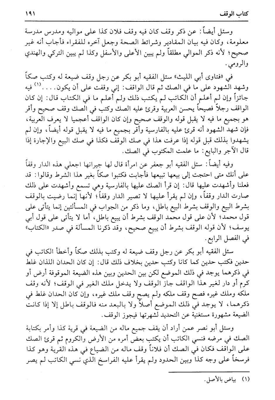 وسئل أبو نصر عمن أراد أن يقف جميع ماله من الضيعة في قرية كذا وأمر بكتابة الصك في مرضه فنسي الكاتب أن يكتب بعض أمره من الأرض والكروم ثم قرئ الصك على الواقف فكان في الصك أن فلاناً وقف ماله من الضياع في هذه القرية وهو كذا فرسخاً على وجه كذا وبين الحدود ولم يقرأ عليه الفراسخ الذي نسي الكاتب لم يصر