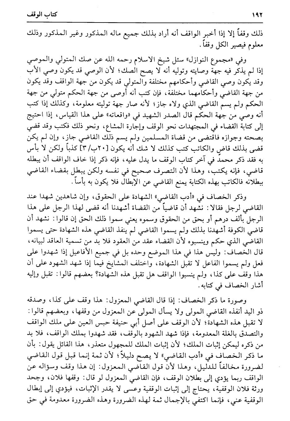 وصورة ما ذكر الخصاف: إذا قال القاضي المعزول: هذا وقف على كذا، وصدقه ذو اليد أنفذه القاضي المولى ولا يسأل المولى عن المعزول من وقفها، وبعضهم قالوا: لا تقبل هذه الشهادة؛ لأن الوقف على أصل أبي حنيفة حبس العين على ملك الواقف والتصدق بالغلة المعدومة، فإذا شهد الشهود بالوقف، فقد شهدوا بملك الواقف، فلا بد من ذكره ليمكن إثبات الملك؛ لأن إثبات الملك للمجهول متعذر، هذا القائل يقول: بأن ما ذكر الخصاف في «أدب القاضي» لا يصح دليلاً؛ لأن ثمة إنما قبل قول القاضي لضرورة مخالفاً للدليل، وهذا لأن (قول) القاضي المعزول: إن هذا وقف وسؤاله عن الواقف ربما يؤدي إلى بطلان الوقف، فإن القاضي المعزول لو قال: وقفها فلان، وجحد ورثة فلان الوقفية، يحتاج إلى إثبات الوقفية وعسى لا يقدر الإثبات، فيؤدي إلى إبطال الوقفية عني، فإنما اكتفي بالإجمال ثمة لهذه الضرورة وهذه الضرورة معدومة في حق