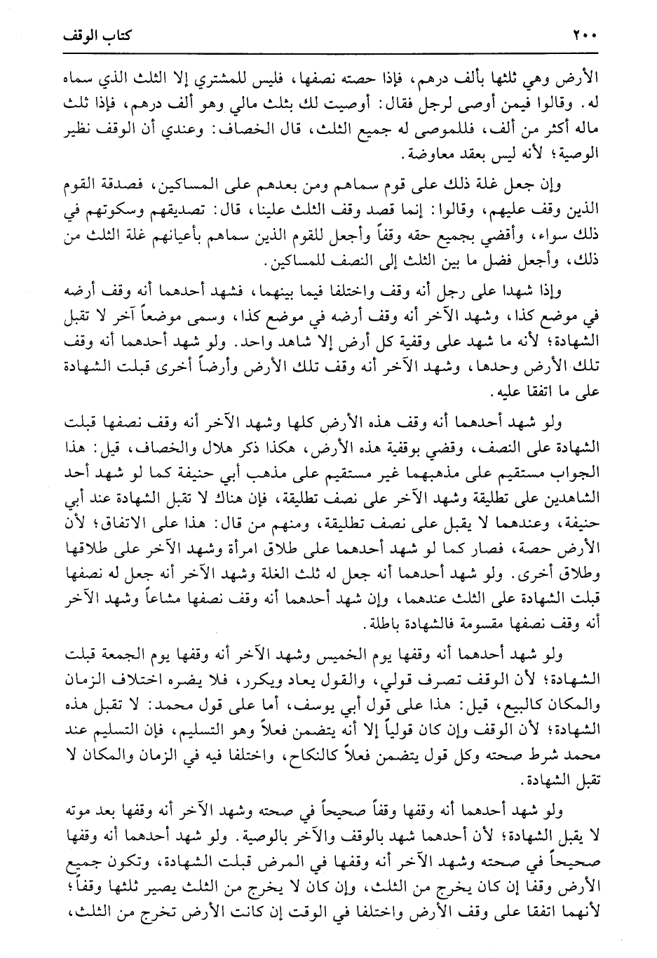 ولو شهد أحدهما أنه وقف هذه الأرض كلها وشهد الآخر أنه وقف نصفها قبلت الشهادة على النصف، وقضي بوقفية هذه الأرض، هكذا ذكر هلال والخصاف، قيل: هذا الجواب مستقيم على مذهبهما غير مستقيم على مذهب أبي حنيفة كما لو شهد أحد الشاهدين على تطليقة وشهد الآخر على نصف تطليقة، فإن هناك لا تقبل الشهادة عند أبي حنيفة، وعندهما لا يقبل على نصف تطليقة، ومنهم من قال: هذا على الإتفاق؛ لأن الأرض حصة، فصار كما لو شهد أحدهما على طلاق امرأة وشهد الآخر على طلاقها وطلاق أخرى. ولو شهد أحدهما أنه جعل له ثلث الغلة وشهد الآخر أنه جعل له نصفها قبلت الشهادة على الثلث عندهما، وإن شهد أحدهما أنه وقف نصفها مشاعاً وشهد الآخر أنه وقف نصفها مقسومة فالشهادة باطلة.