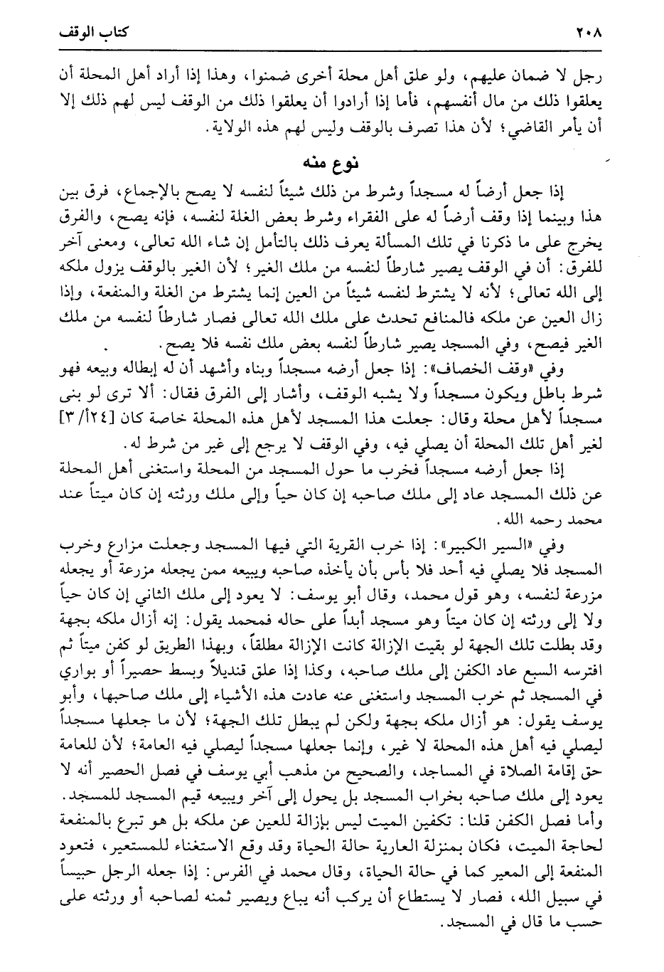 وفي «وقف الخصاف» : إذا جعل أرضه مسجداً وبناه وأشهد أن له إبطاله وبيعه فهو شرط باطل ويكون مسجداً ولا يشبه الوقف، وأشار إلى الفرق فقال: ألا ترى لو بنى مسجداً لأهل محلة وقال: جعلت هذا المسجد لأهل هذه المحلة خاصة كان (24أ3) لغير أهل تلك المحلة أن يصلي فيه، وفي الوقف لا يرجع إلى غير من شرط له.