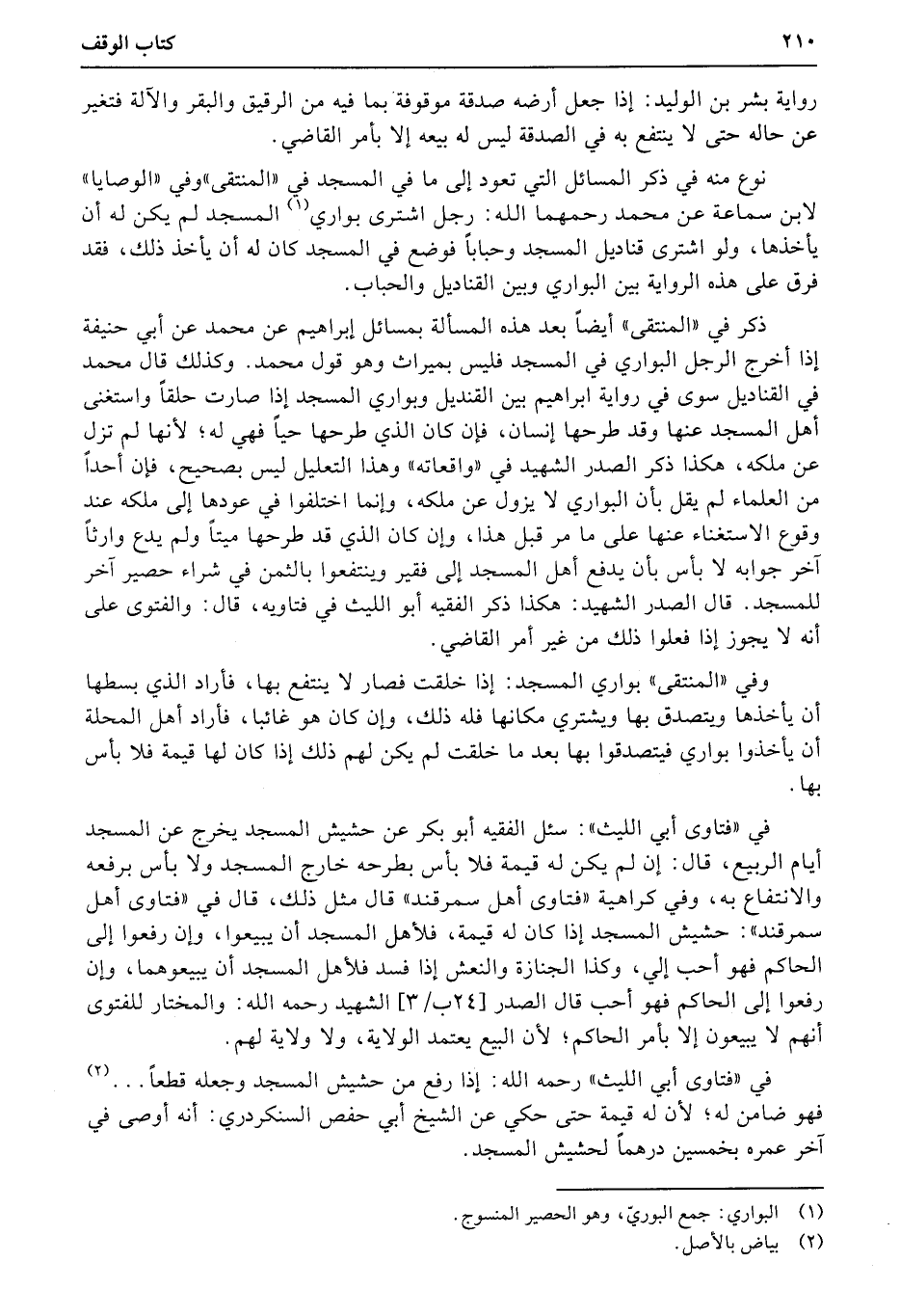 نوع منه في ذكر المسائل التي تعود إلى ما في المسجد في «المنتقى» وفي «الوصايا» لابن سماعة عن محمد رحمهما الله: رجل اشترى بواري المسجد لم يكن له أن يأخذها، ولو اشترى قناديل المسجد وحباباً فوضع في المسجد كان له أن يأخذ ذلك، فقد فرق على هذه الرواية بين البواري وبين القناديل والحباب.