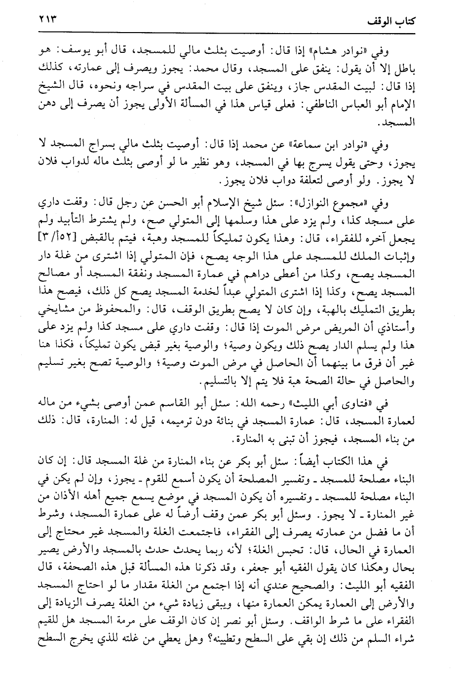 في هذا الكتاب أيضاً: سئل أبو بكر عن بناء المنارة من غلة المسجد قال: إن كان البناء مصلحة للمسجد * وتفسير المصلحة أن يكون أسمع للقوم * يجوز، وإن لم يكن في البناء مصلحة للمسجد * وتفسيره أن يكون المسجد في موضع يسمع جميع أهله الأذان من غير المنارة * لا يجوز. وسئل أبو بكر عمن وقف أرضاً له على عمارة المسجد، وشرط أن ما فضل من عمارته يصرف إلى الفقراء، فاجتمعت الغلة والمسجد غير محتاج إلى العمارة في الحال، قال: تحبس الغلة؛ لأنه ربما يحدث حدث بالمسجد والأرض يصير بحال وهكذا كان يقول الفقيه أبو جعفر، وقد ذكرنا هذه المسألة قبل هذه الصحفة، قال الفقيه أبو الليث: والصحيح عندي أنه إذا اجتمع من الغلة مقدار ما لو احتاج المسجد والأرض إلى العمارة يمكن العمارة منها، ويبقى زيادة شيء من الغلة يصرف الزيادة إلى الفقراء على ما شرط الواقف. وسئل أبو نصر (إن) كان الوقف على مرمة المسجد هل للقيم شراء السلم من ذلك إن بقي على السطح وتطيينه؟ وهل يعطي من غلته للذي يخرج السطح