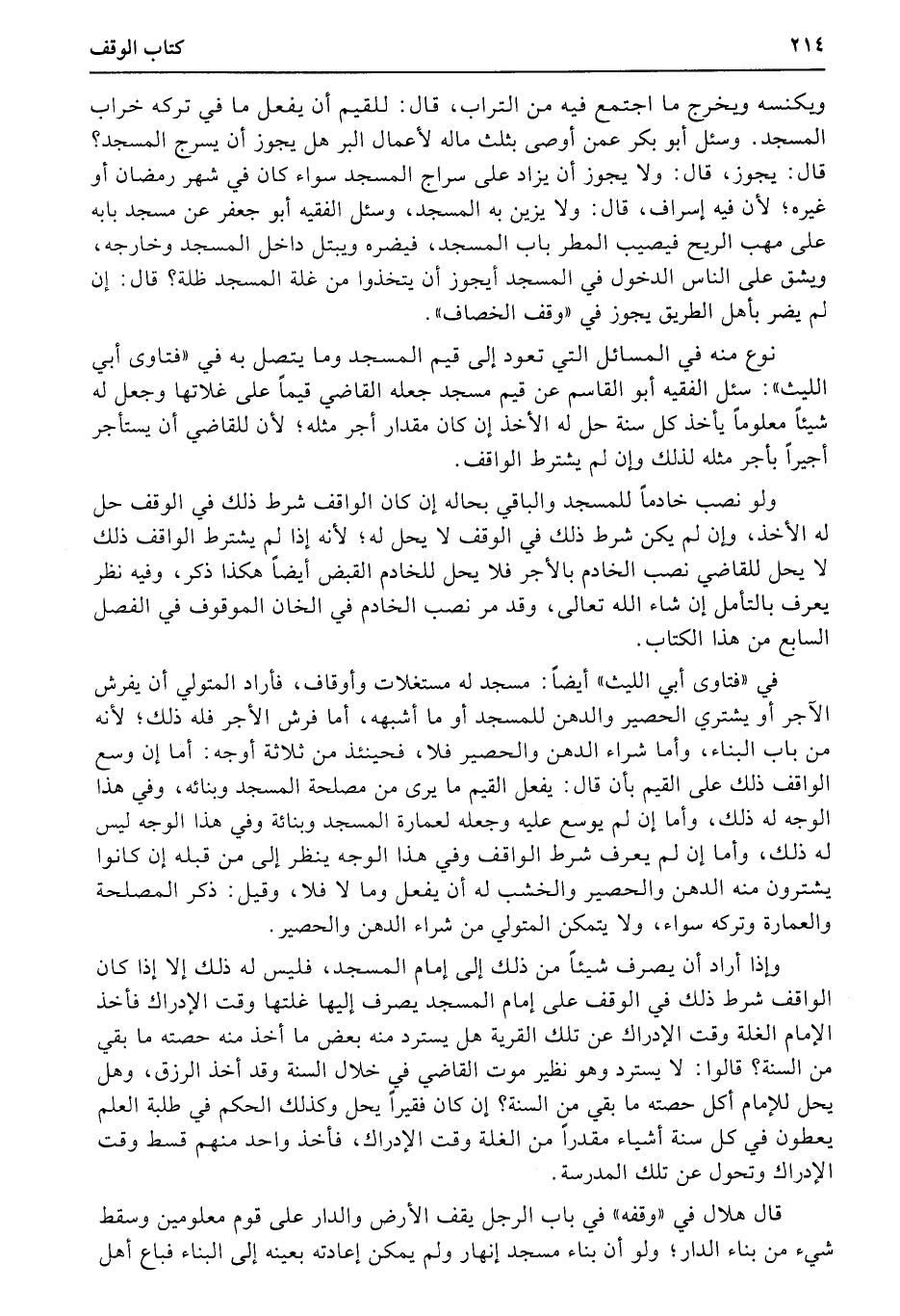 ويكنسه ويخرج ما اجتمع فيه من التراب، قال: للقيم أن يفعل ما في تركه خراب المسجد. وسئل أبو بكر عمن أوصى بثلث ماله لأعمال البر هل يجوز أن يسرج المسجد؟ قال: يجوز، قال: ولا يجوز أن يزاد على سراج المسجد سواء كان في شهر رمضان أو غيره؛ لأن فيه إسراف، قال: ولا يزين به المسجد، وسئل الفقيه أبو جعفر عن مسجد بابه على مهب الريح فيصيب المطر باب المسجد، فيضره ويبتل داخل المسجد وخارجه، ويشق على الناس الدخول في المسجد أيجوز أن يتخذوا من غلة المسجد ظلة؟ قال: إن لم يضر بأهل الطريق يجوز في «وقف الخصاف» .