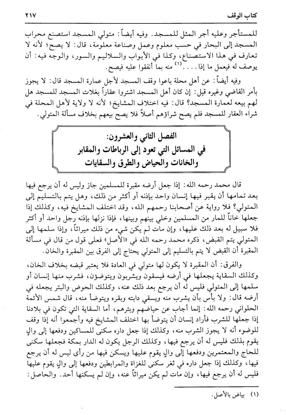 الفصل الثاني والعشرون: في المسائل التي تعود إلى الرباطات والمقابر والخانات والحياض والطرق والسقايات