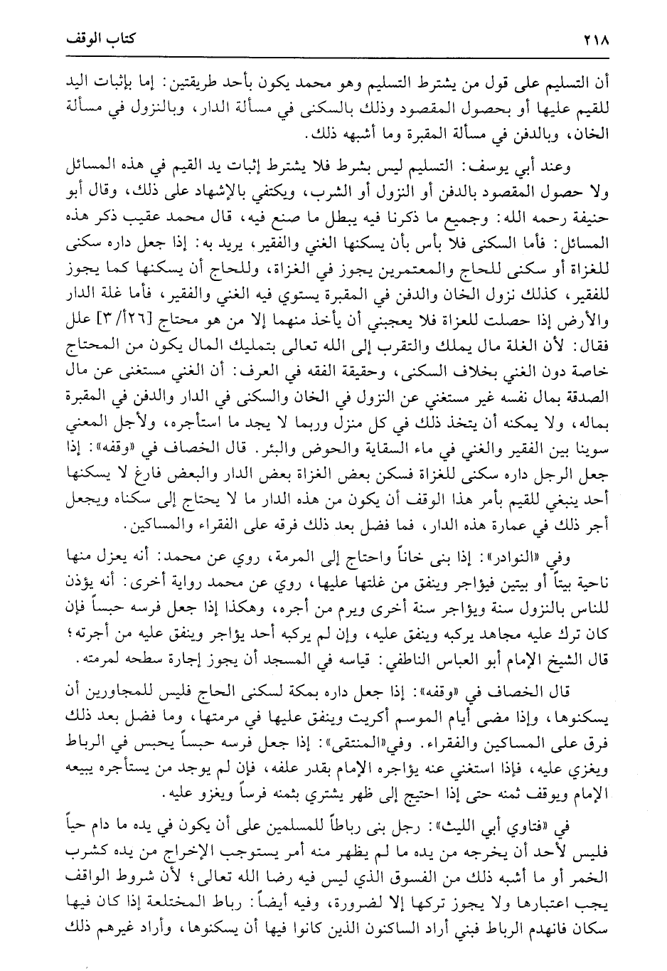 وعند أبي يوسف: التسليم ليس بشرط فلا يشترط إثبات يد القيم في هذه المسائل ولا حصول المقصود بالدفن أو النزول أو الشرب، ويكتفي بالإشهاد على ذلك، وقال أبو حنيفة رحمه الله: وجميع ما ذكرنا فيه يبطل ما صنع فيه، قال محمد عقيب ذكر هذه المسائل: فأما السكنى فلا بأس بأن يسكنها الغني والفقير، يريد به: إذا جعل داره سكنى للغزاة أو سكنى للحاج والمعتمرين يجوز في الغزاة، وللحاج أن يسكنها كما يجوز للفقير، كذلك نزول الخان والدفن في المقبرة يستوي فيه الغني والفقير، فأما غلة الدار والأرض إذا حصلت للعزاة فلا يعجبني أن يأخذ منهما إلا من هو محتاج (26أ3) علل فقال: لأن الغلة مال يملك والتقرب إلى الله تعالى بتمليك المال يكون من المحتاج خاصة دون الغني بخلاف السكنى، وحقيقة الفقه في العرف: أن الغني مستغني عن مال الصدقة بمال نفسه غير مستغني عن النزول في الخان والسكنى في الدار والدفن في المقبرة بماله، ولا يمكنه أن يتخذ ذلك في كل منزل وربما لا يجد ما استأجره، ولأجل المعني سوينا بين الفقير والغني في ماء السقاية والحوض والبئر. قال الخصاف في «وقفه» : إذا جعل الرجل داره سكنى للغزاة فسكن بعض الغزاة بعض الدار والبعض فارغ لا يسكنها أحد ينبغي للقيم بأمر هذا الوقف أن يكون من هذه الدار ما لا يحتاج إلى سكناه ويجعل أجر ذلك في عمارة هذه الدار، فما فضل بعد ذلك فرقه على الفقراء والمساكين.