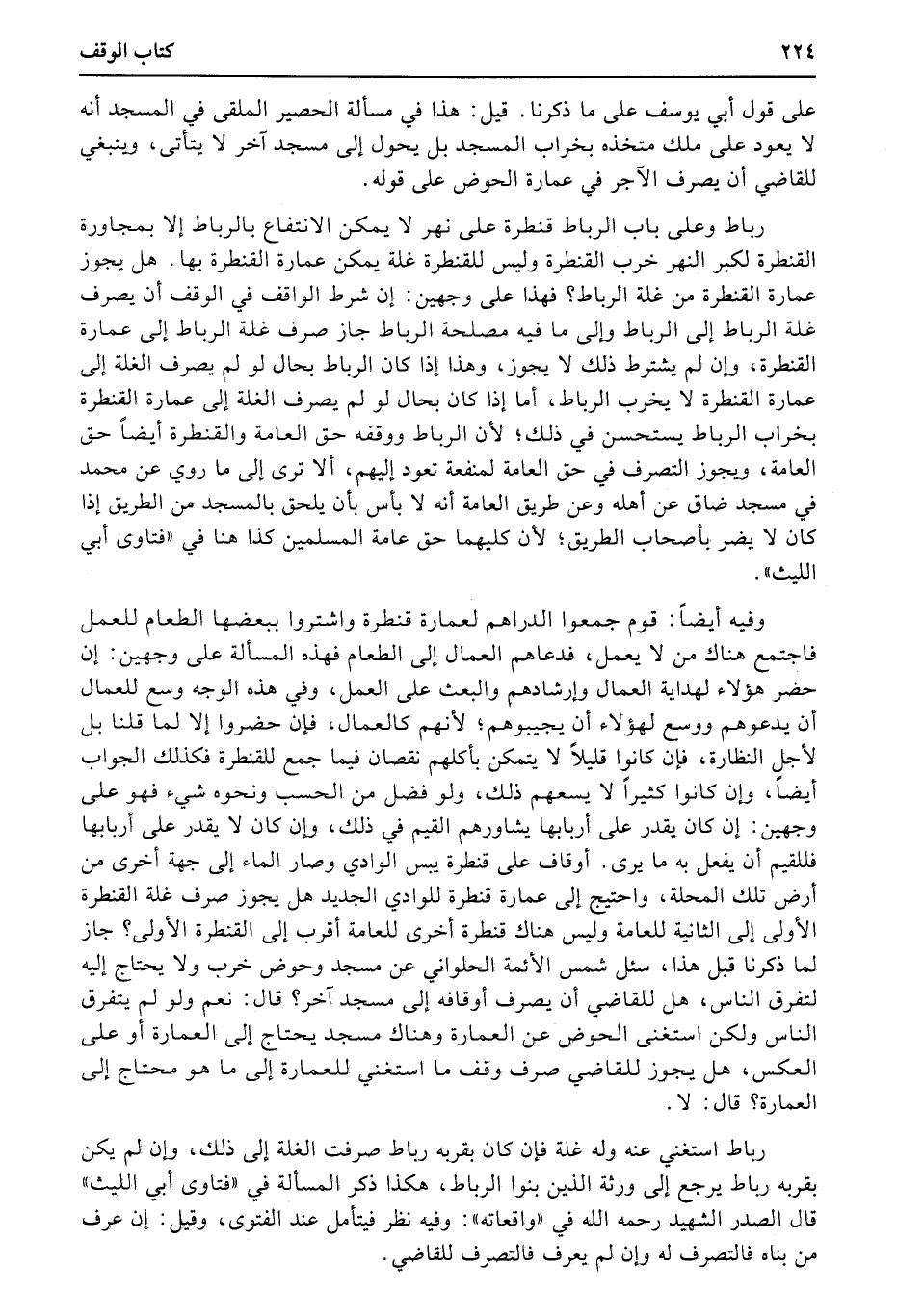 إن شرط الواقف في الوقف أن يصرف غلة الرباط إلى الرباط وإلى ما فيه مصلحة الرباط جاز صرف غلة الرباط إلى عمارة القنطرة، وإن لم يشترط ذلك لا يجوز، وهذا إذا كان الرباط بحال لو لم يصرف الغلة إلى عمارة القنطرة لا يخرب الرباط، أما إذا كان بحال لو لم يصرف الغلة إلى عمارة القنطرة بخراب الرباط يستحسن في ذلك؛ لأن الرباط ووقفه حق العامة والقنطرة أيضاً حق العامة، ويجوز التصرف في حق العامة لمنفعة تعود إليهم، ألا ترى إلى ما روي عن محمد في مسجد ضاق عن أهله وعن طريق العامة أنه لا بأس بأن يلحق بالمسجد من الطريق إذا كان لا يضر بأصحاب الطريق؛ لأن كليهما حق عامة المسلمين كذا هنا في «فتاوي أبي الليث» .