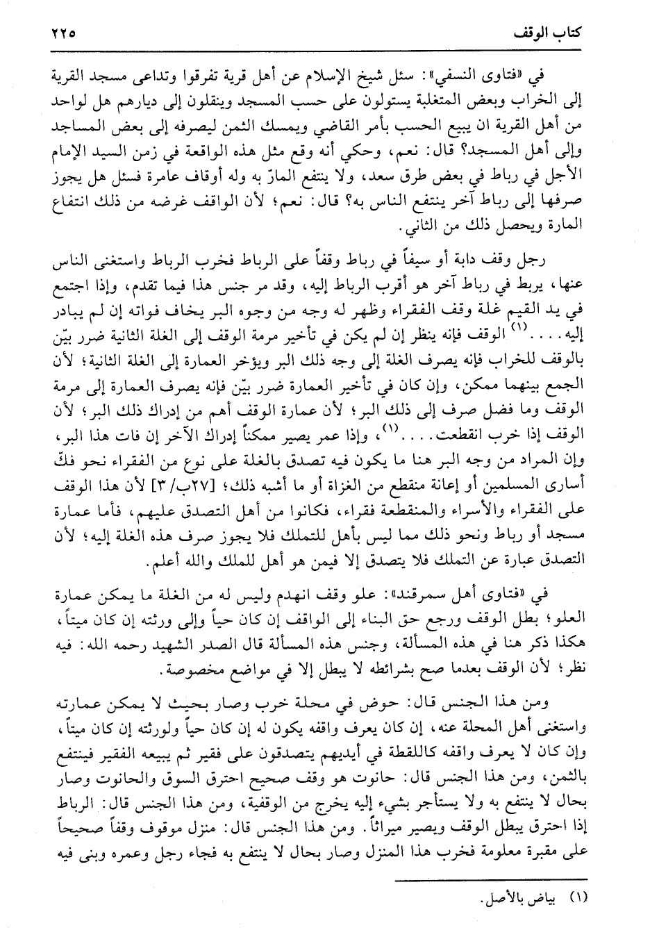 رجل (وقف) دابة أو سيفاً في رباط وقفاً على الرباط فخرب الرباط واستغنى الناس عنها، يربط في رباط آخر هو أقرب الرباط إليه، وقد مر جنس هذا فيما تقدم، وإذا اجتمع في يد القيم غلة وقف الفقراء وظهر له وجه من وجوه البر يخاف فواته إن لم يبادر إليه.... الوقف فإنه ينظر إن لم يكن في تأخير مرمة الوقف إلى الغلة الثانية ضرر بيّن بالوقف للخراب فإنه يصرف الغلة إلى وجه ذلك البر ويؤخر العمارة إلى الغلة الثانية؛ لأن الجمع بينهما ممكن، وإن كان في تأخير العمارة ضرر بيّن فإنه يصرف العمارة إلى مرمة الوقف وما فضل صرف إلى ذلك البر؛ لأن عمارة الوقف أهم من إدراك ذلك البر؛ لأن الوقف إذا خرب انقطعت....، وإذا عمر يصير ممكناً إدراك الآخر إن فات هذا البر، وإن المراد من وجه البر هنا ما يكون فيه تصدق بالغلة على نوع من الفقراء نحو فكّ أسارى المسلمين أو إعانة منقطع من الغزاة أو ما أشبه ذلك؛ (27ب3) لأن هذا الوقف على الفقراء والأسراء والمنقطعة فقراء، فكانوا من أهل التصدق عليهم، فأما عمارة مسجد أو رباط ونحو ذلك مما ليس بأهل للتملك فلا يجوز صرف هذه الغلة إليه؛ لأن التصدق عبارة عن التملك فلا يتصدق إلا فيمن هو أهل للملك والله أعلم.
