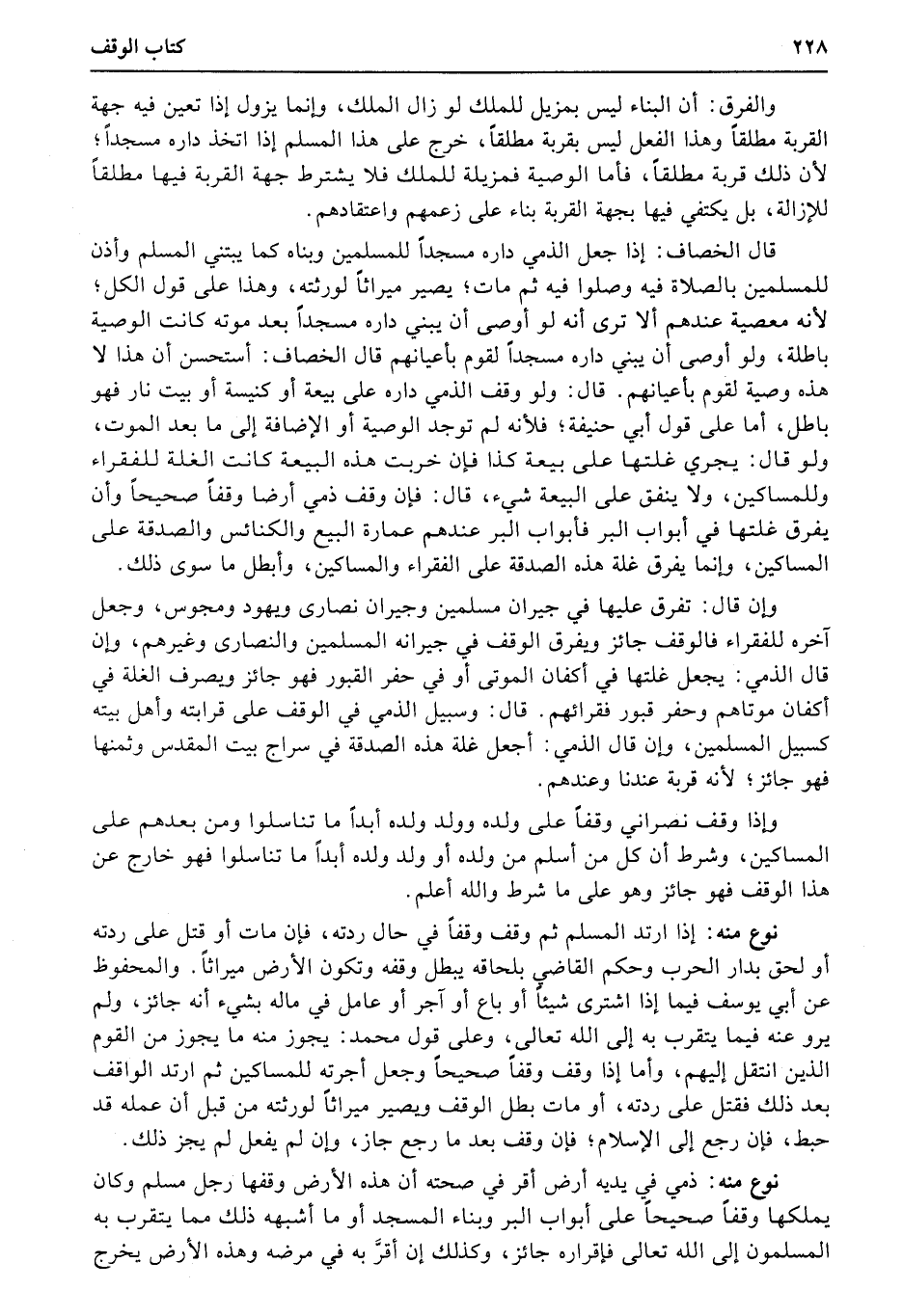 نوع منه: إذا ارتد المسلم ثم وقف وقفاً في حال ردته، فإن مات أو قتل على ردته أو لحق بدار الحرب وحكم القاضي بلحاقه يبطل وقفه وتكون الأرض ميراثاً. والمحفوظ عن أبي يوسف فيما إذا اشترى شيئاً أو باع أو آجر أو عامل في ماله بشيء أنه جائز، ولم يرو عنه فيما يتقرب (به) إلى الله تعالى، وعلى قول محمد: يجوز منه ما يجوز من القوم الذين انتقل إليهم، وأما إذا وقف وقفاً صحيحاً وجعل أجرته للمساكين ثم ارتد الواقف بعد ذلك فقتل على ردته، أو مات بطل الوقف ويصير ميراثاً لورثته من قبل أن عمله قد حبط، فإن رجع إلى الإسلام؛ فإن وقف بعد ما رجع جاز، وإن لم يفعل لم يجز ذلك.