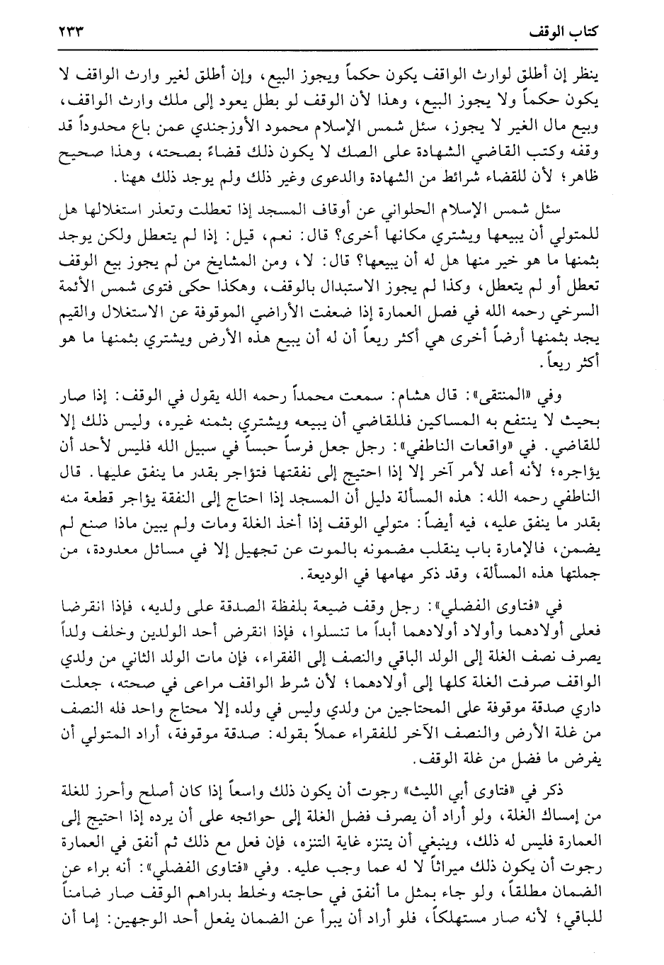 سئل شمس الإسلام الحلواني عن أوقاف المسجد إذا تعطلت وتعذر استغلالها هل للمتولي أن يبيعها ويشتري مكانها أخرى؟ قال: نعم، قيل: إذا لم يتعطل ولكن يوجد بثمنها ما هو خير منها هل له أن يبيعها؟ قال: لا، ومن المشايخ من لم يجوز بيع الوقف تعطل أو لم يتعطل، وكذا لم يجوز الاستبدال بالوقف، وهكذا حكى فتوى شمس الأئمة السرخي رحمه الله في فصل العمارة إذا ضعفت الأراضي الموقوفة عن الاستغلال والقيم يجد بثمنها أرضاً أخرى هي أكثر ريعاً أن له أن يبيع هذه الأرض ويشتري بثمنها ما هو أكثر ريعاً.