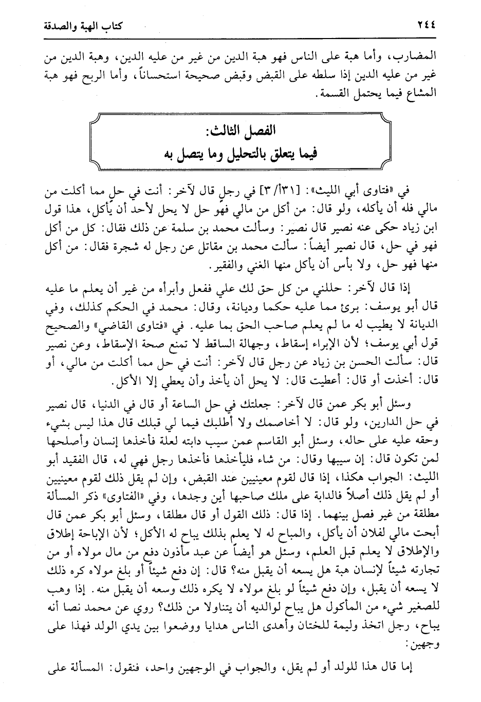 وسئل أبو بكر عمن قال لآخر: جعلتك في حل الساعة أو قال في الدنيا، قال نصير في حل الدارين، ولو قال: لا أخاصمك ولا أطلبك فيما لي قبلك قال هذا ليس بشيء وحقه عليه على حاله، وسئل أبو القاسم عمن سيب دابته لعلة فأخذها إنسان وأصلحها لمن تكون قال: إن سيبها وقال: من شاء فليأخذها فأخذها رجل فهي له، قال الفقيد أبو الليث: الجواب هكذا، إذا قال لقوم معينيين عند القبض، وإن لم يقل ذلك لقوم معينيين أو لم يقل ذلك أصلاً فالدابة على ملك صاحبها أين وجدها، وفي «الفتاوي» ذكر المسألة مطلقة من غير فصل بينهما. إذا قال: ذلك القول أو قال مطلقا، وسئل أبو بكر عمن قال أبحت مالي لفلان أن يأكل، والمباح له لا يعلم بذلك يباح له الأكل؛ لأن الإباحة إطلاق والإطلاق لا يعلم قبل العلم، وسئل هو أيضاً عن عبد مأذون دفع من مال مولاه أو من تجارته شيئاً لإنسان هبة هل يسعه أن يقبل منه؟ قال: إن دفع شيئاً أو بلغ مولاه كره ذلك لا يسعه أن يقبل، وإن دفع شيئاً لو بلغ مولاه لا يكره ذلك وسعه أن يقبل منه. إذا وهب للصغير شيء من المأكول هل يباح لوالديه أن يتناولا من ذلك؟ روي عن محمد نصا أنه يباح، رجل اتخذ وليمة للختان وأهدى الناس هدايا ووضعوا بين يدي الولد فهذا على وجهين:
