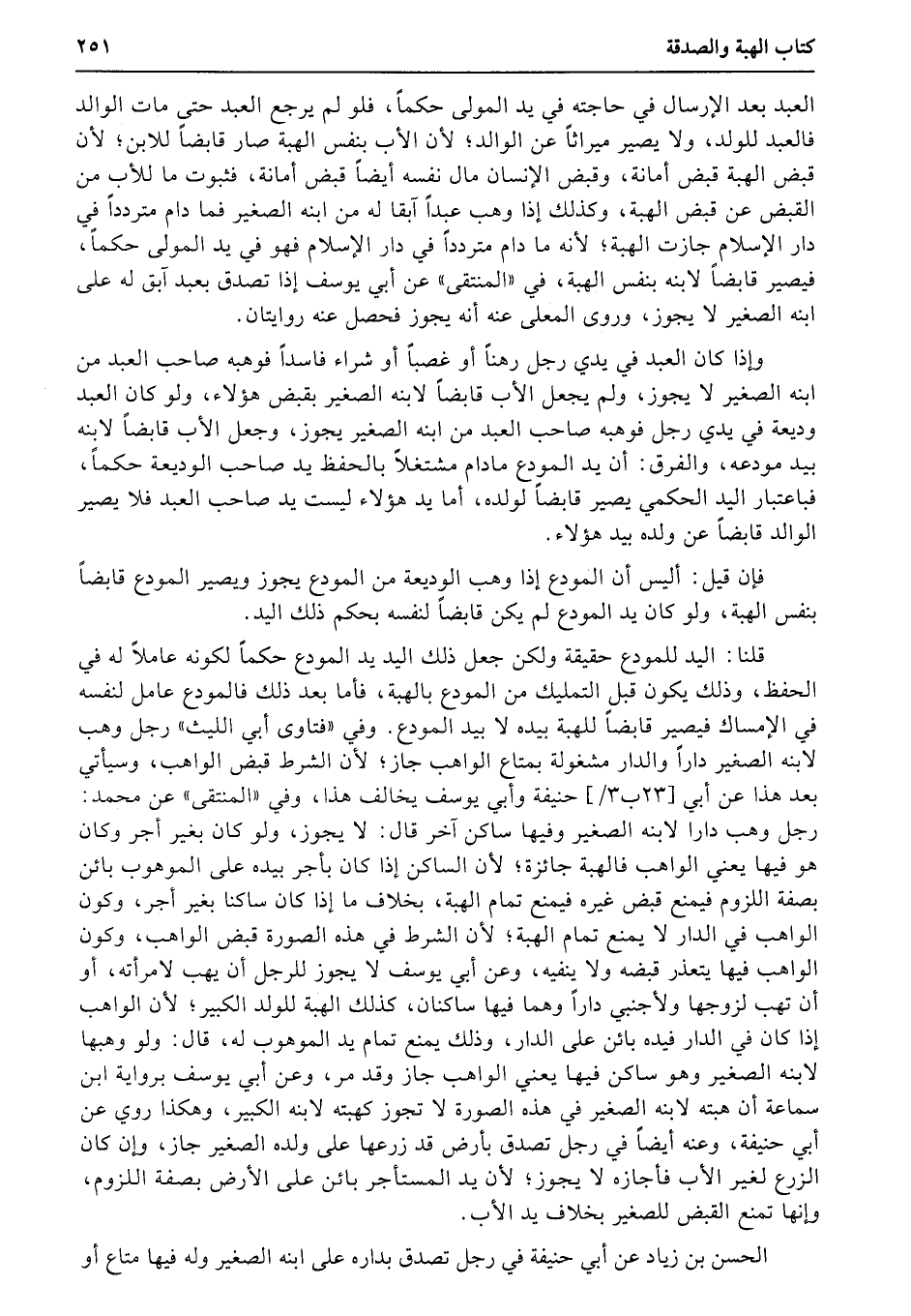 العبد بعد الإرسال في حاجته في يد المولى حكماً، فلو لم يرجع العبد حتى مات الوالد فالعبد للولد، ولا يصير ميراثاً عن الوالد؛ لأن الأب بنفس الهبة صار قابضاً للابن؛ لأن قبض الهبة قبض أمانة، وقبض الإنسان مال نفسه أيضاً قبض أمانة، فثبوت ما للأب من القبض عن قبض الهبة، وكذلك إذا وهب عبداً آبقا له من ابنه الصغير فما دام متردداً في دار الإسلام جازت الهبة؛ لأنه ما دام متردداً في دار الإسلام فهو في يد المولى حكماً، فيصير قابضاً لابنه بنفس الهبة، في «المنتقى» عن أبي يوسف إذا تصدق بعبد آبق له على ابنه الصغير لا يجوز، وروى المعلى عنه أنه يجوز فحصل عنه روايتان.