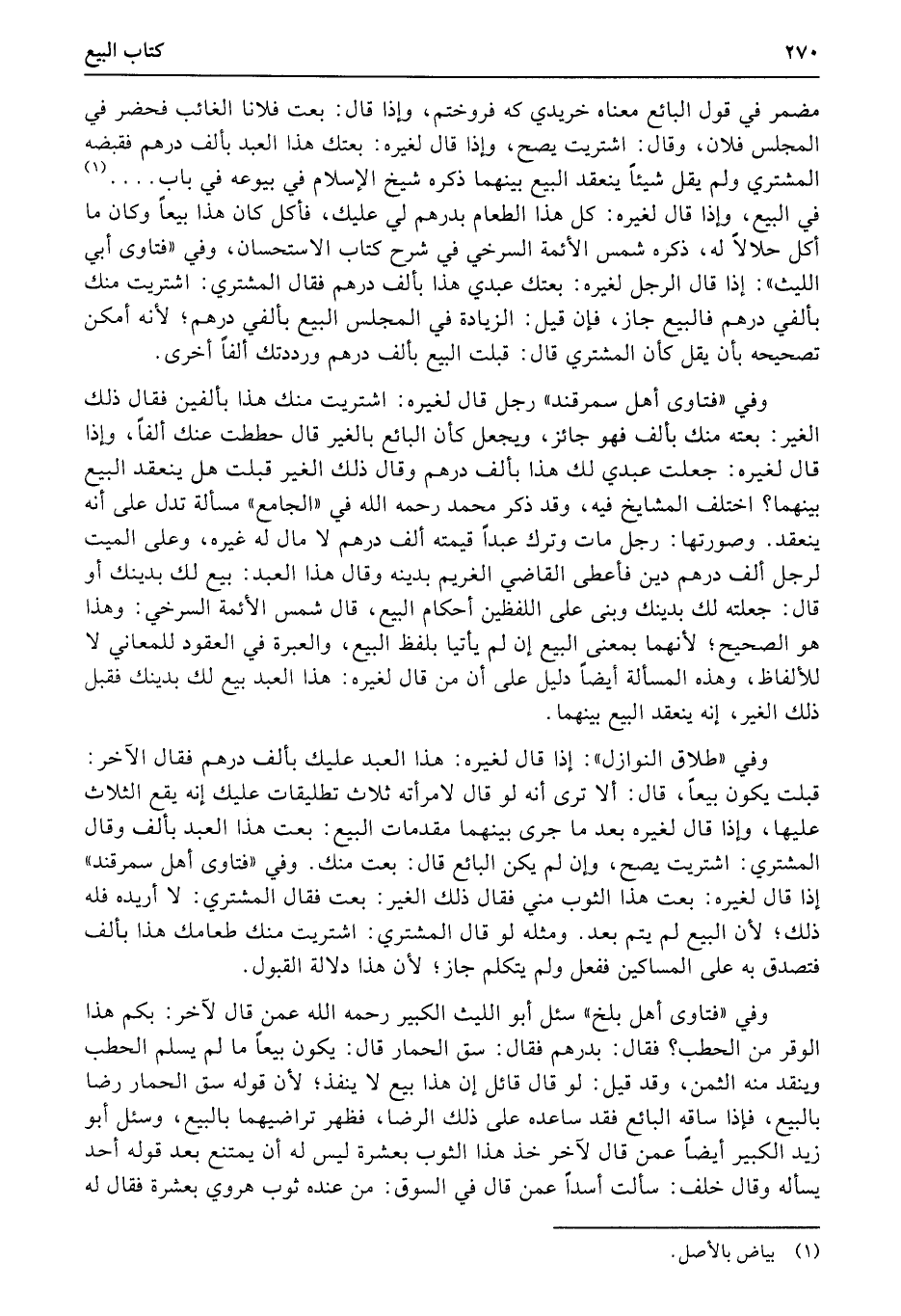 وفي «فتاوي أهل بلخ» سئل أبو الليث الكبير رحمه الله عمن قال لآخر: بكم هذا الوقر من الحطب؟ فقال: بدرهم فقال: سق الحمار قال: يكون بيعاً ما لم يسلم الحطب وينقد منه الثمن، وقد قيل: لو قال قائل إن هذا بيع لا ينفذ؛ لأن قوله سق الحمار رضا بالبيع، فإذا ساقه البائع فقد ساعده على ذلك الرضا، فظهر تراضيهما بالبيع، وسئل أبو زيد الكبير أيضاً عمن قال لآخر خذ هذا الثوب بعشرة ليس له أن يمتنع بعد قوله أحد يسأله وقال خلف: سألت أسداً عمن قال في السوق: من عنده ثوب هروي بعشرة فقال له