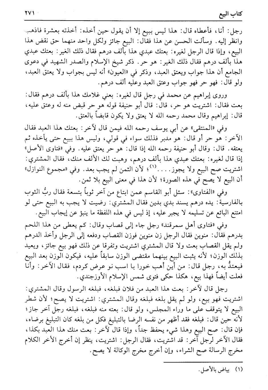 وفي «المنتقى» عن أبي يوسف رحمه الله فيمن قال لآخر: بعتك هذا العبد فقال الآخر: هو حر أو قال: هو مدبر فذلك سواء في قولي، وليس هذا ببيع حتى يأخذه ثم يعتقه. قال: وقال أبو حنيفة رحمه الله إذا قال: هو حر يعتق عليه. وفي «فتاوى الأصل» إذا قال لغيره: بعتك عبدي هذا بألف درهم، وهبت لك الألف منك، فقال المشتري: اشتريت صح البيع ولا يجوز....؛ لأن الثمن لم يجب بعد. وفي «مجموع النوازل» أن البيع لا يصح في هذه الصورة؛ لأن هذا في معنى البيع بلا ثمن.
