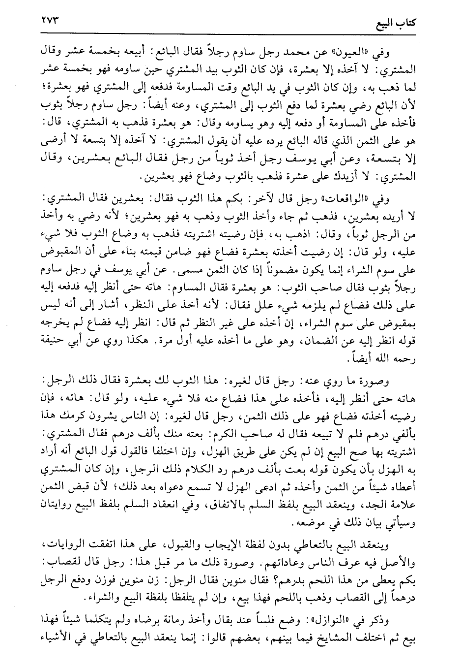 وفي «الواقعات» رجل قال لآخر: بكم هذا الثوب فقال: بعشرين فقال المشتري: لا أريده بعشرين، فذهب ثم جاء وأخذ الثوب وذهب به فهو بعشرين؛ لأنه رضي به وأخذ من الرجل ثوباً، وقال: اذهب به، فإن رضيته اشتريته فذهب به وضاع الثوب فلا شيء عليه، ولو قال: إن رضيت أخذته بعشرة فضاع فهو ضامن قيمته بناء على أن المقبوض على سوم الشراء إنما يكون مضموناً إذا كان الثمن مسمى. عن أبي يوسف في رجل ساوم رجلاً بثوب فقال صاحب الثوب: هو بعشرة فقال المساوم: هاته حتى أنظر إليه فدفعه إليه على ذلك فضاع لم يلزمه شيء علل فقال: لأنه أخذ على النظر، أشار إلى أنه ليس بمقبوض على سوم الشراء، إن أخذه على غير النظر ثم قال: انظر إليه فضاع لم يخرجه قوله انظر إليه عن الضمان، وهو على ما أخذه عليه أول مرة. هكذا روي عن أبي حنيفة رحمه الله أيضاً.