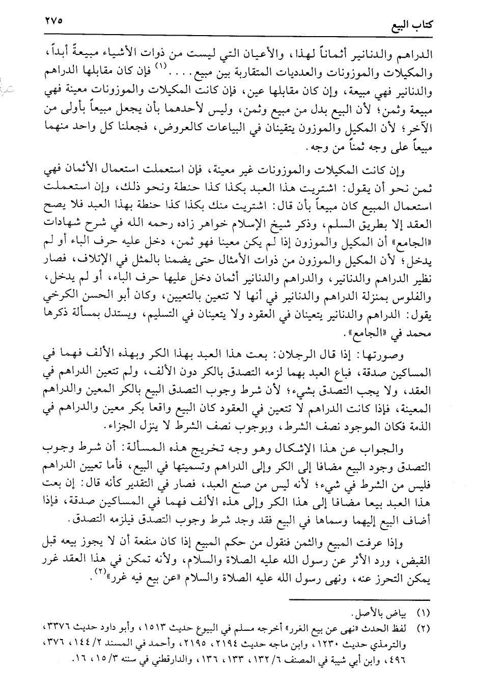 وإن كانت المكيلات والموزونات غير معينة، فإن استعملت استعمال الأثمان فهي ثمن نحو أن يقول: اشتريت هذا العبد بكذا كذا حنطة ونحو ذلك، وإن استعملت استعمال المبيع كان مبيعاً بأن قال: اشتريت منك بكذا كذا حنطة بهذا العبد فلا يصح العقد إلا بطريق السلم، وذكر شيخ الإسلام خواهر زاده رحمه الله في شرح شهادات «الجامع» أن المكيل والموزون إذا لم يكن معينا فهو ثمن، دخل عليه حرف الباء أو لم يدخل؛ لأن المكيل والموزون من ذوات الأمثال حتى يضمنا بالمثل في الإتلاف، فصار نظير الدراهم والدنانير، والدراهم والدنانير أثمان دخل عليها حرف الباء، أو لم يدخل، والفلوس بمنزلة الدراهم والدنانير في أنها لا تتعين بالتعيين، وكان أبو الحسن الكرخي يقول: الدراهم والدنانير يتعينان في العقود ولا يتعينان في التسليم، ويستدل بمسألة ذكرها محمد في «الجامع» .