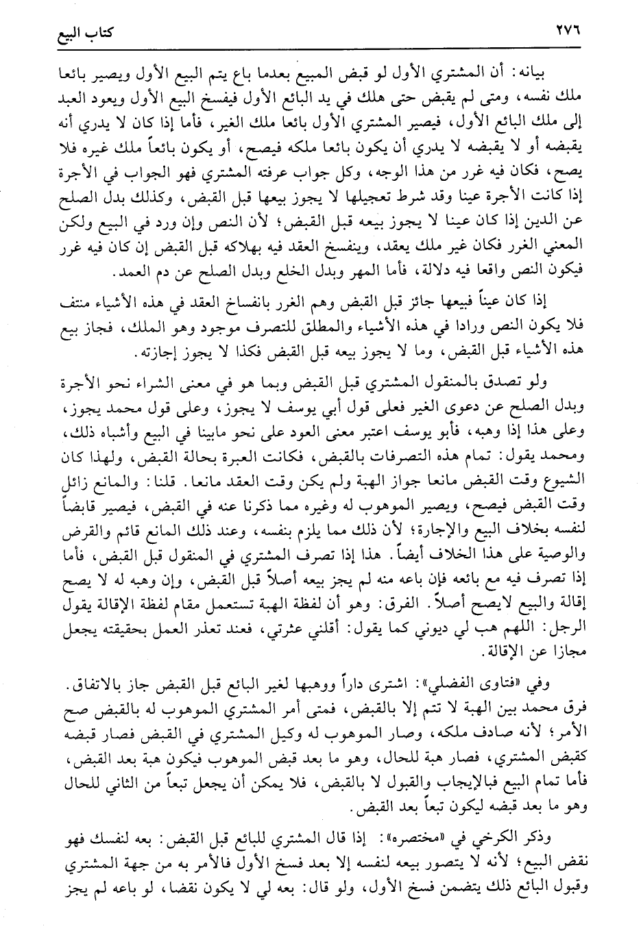 ولو تصدق بالمنقول المشتري قبل القبض وبما هو في معنى الشراء نحو الأجرة وبدل الصلح عن دعوى الغير فعلى قول أبي يوسف لا يجوز، وعلى قول محمد يجوز، وعلى هذا إذا وهبه، فأبو يوسف اعتبر معنى العود على نحو مابينا في البيع وأشباه ذلك، ومحمد يقول: تمام هذه التصرفات بالقبض، فكانت العبرة بحالة القبض، ولهذا كان الشيوع وقت القبض مانعا جواز الهبة ولم يكن وقت العقد مانعا. قلنا: والمانع زائل وقت القبض فيصح، ويصير الموهوب له وغيره مما ذكرنا عنه في القبض، فيصير قابضا لنفسه بخلاف البيع والإجارة؛ لأن ذلك مما يلزم بنفسه، وعند ذلك المانع قائم والقرض والوصية على هذا الخلاف أيضاً. هذا إذا تصرف المشتري في المنقول قبل القبض، فأما إذا تصرف فيه مع بائعه فإن باعه منه لم يجز بيعه أصلاً قبل القبض، وإن وهبه له لا يصح إقالة والبيع لايصح أصلاً.