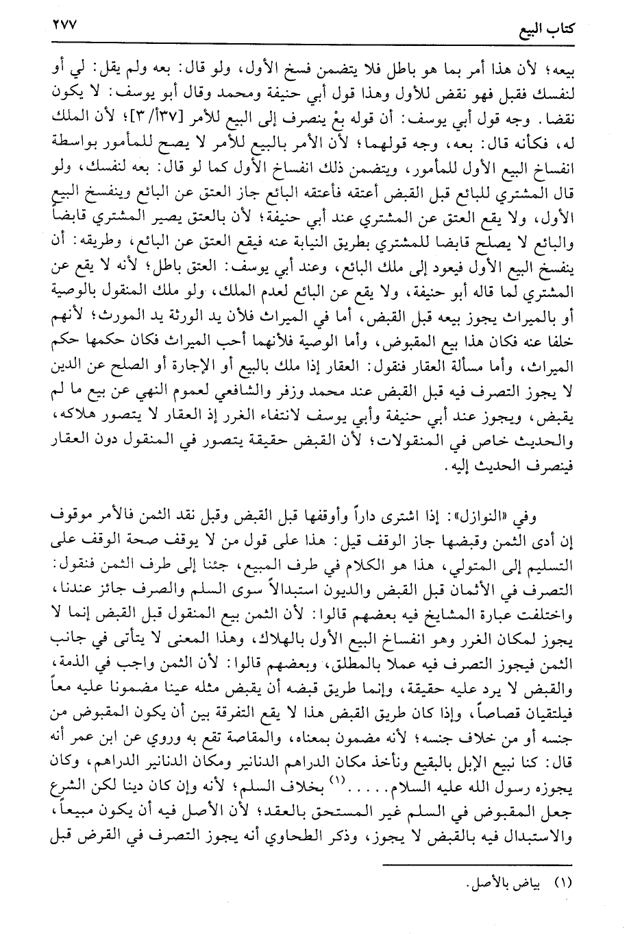 وفي «النوازل» : إذا اشترى دارا وأوقفها قبل القبض وقبل نقد الثمن فالأمر موقوف إن أدى الثمن وقبضها جاز الوقف قيل: هذا على قول من لا يوقف صحة الوقف على التسليم إلى المتولي، هذا هو الكلام في طرف المبيع، جئنا إلى طرف الثمن فنقول: التصرف في الأثمان قبل القبض والديون استبدالا سوى السلم والصرف جائز عندنا، واختلفت عبارة المشايخ فيه بعضهم قالوا: لأن الثمن بيع المنقول قبل القبض إنما لا يجوز لمكان الغرر وهو انفساخ البيع الأول بالهلاك، وهذا المعنى لا يتأتى في جانب الثمن فيجوز التصرف فيه عملا بالمطلق، وبعضهم قالوا: لأن الثمن واجب في الذمة، والقبض لا يرد عليه حقيقة، وإنما طريق قبضه أن يقبض مثله عينا مضمونا عليه معاً فيلتقيان قصاصاً، وإذا كان طريق القبض هذا لا يقع التفرقة بين أن يكون المقبوض من جنسه أو من خلاف جنسه؛ لأنه مضمون بمعناه، والمقاصة تقع به وروي عن ابن عمر أنه قال: كنا نبيع الإبل بالبقيع ونأخذ مكان الدراهم الدنانير ومكان الدنانير الدراهم، وكان يجوزه رسول الله عليه السلام..... بخلاف السلم؛ لأنه وإن كان دينا لكن الشرع جعل المقبوض في السلم غير المستحق بالعقد؛ لأن الأصل فيه أن يكون مبيعاً، والاستبدال فيه بالقبض لا يجوز، وذكر الطحاوي أنه يجوز التصرف في القرض قبل