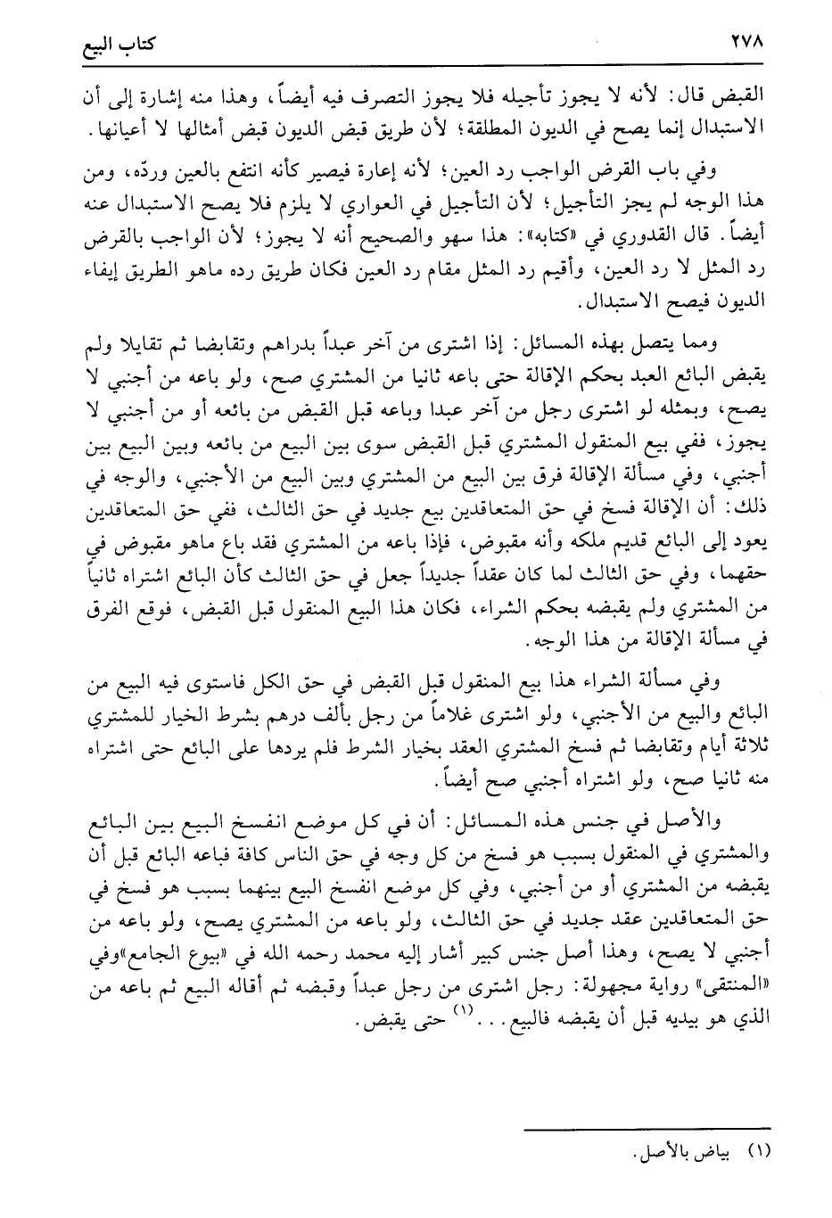 ومما يتصل بهذه المسائل: إذا اشترى من آخر عبدا بدراهم وتقابضا ثم تقايلا ولم يقبض البائع العبد بحكم الإقالة حتى باعه ثانيا من المشتري صح، ولو باعه من أجنبي لا يصح، وبمثله لو اشترى رجل من آخر عبدا وباعه قبل القبض من بائعه أو من أجنبي لا يجوز، ففي بيع المنقول المشتري قبل القبض سوى بين البيع من بائعه وبين البيع بين أجنبي، وفي مسألة الإقالة فرق بين البيع من المشتري وبين البيع من الأجنبي، والوجه في ذلك: أن الإقالة فسخ في حق المتعاقدين بيع جديد في حق الثالث، ففي حق المتعاقدين يعود إلى البائع قديم ملكه وأنه مقبوض، فإذا باعه من المشتري فقد باع ماهو مقبوض في حقهما، وفي حق الثالث لما كان عقداً جديداً جعل في حق الثالث كأن البائع اشتراه ثانياً من المشتري ولم يقبضه بحكم الشراء، فكان هذا البيع المنقول قبل القبض، فوقع الفرق في مسألة الإقالة من هذا الوجه.