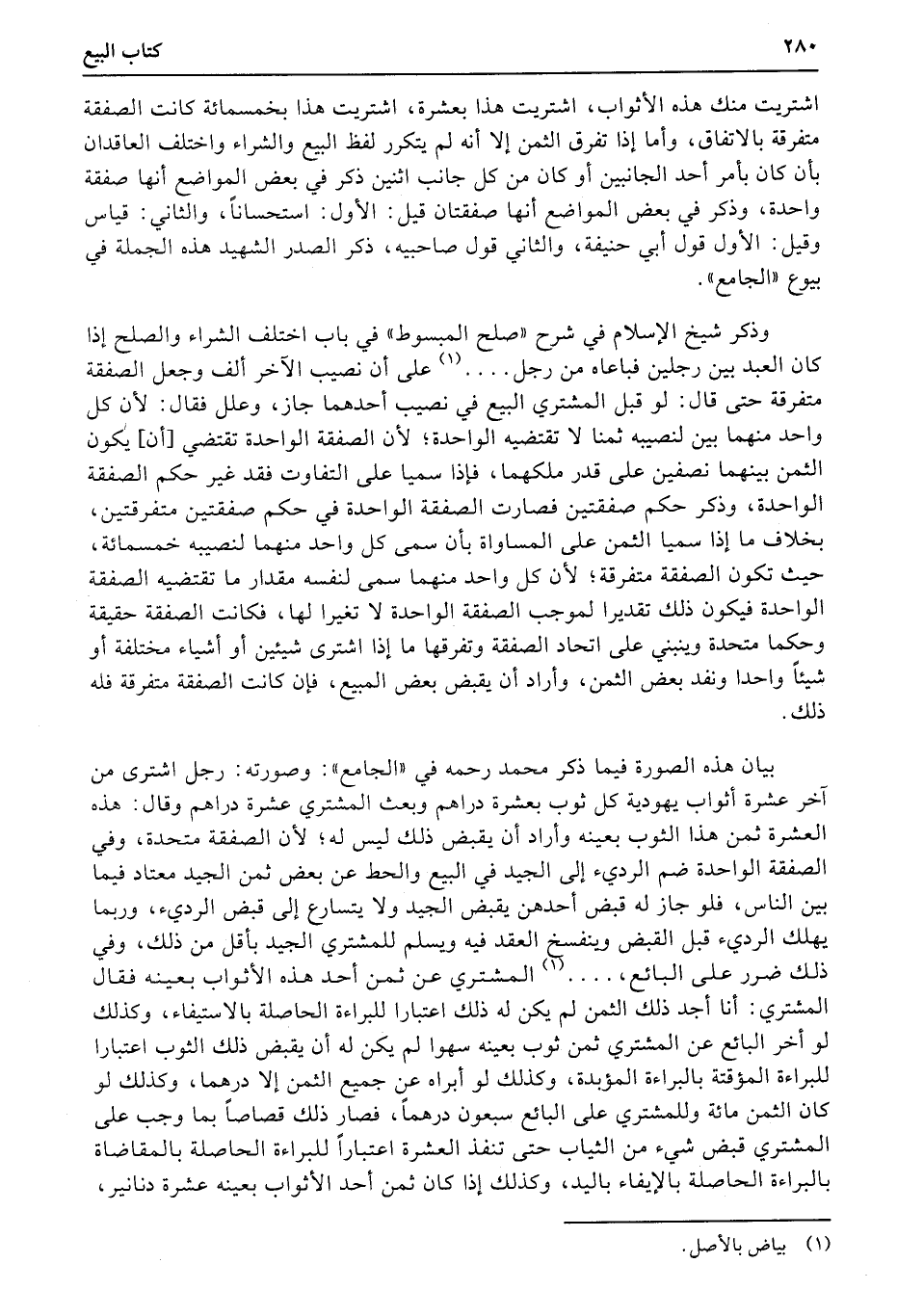 وذكر شيخ الإسلام في شرح «صلح المبسوط» في باب اختلف الشراء والصلح إذا كان العبد بين رجلين فباعاه من رجل.... على أن نصيب الآخر ألف وجعل الصفقة متفرقة حتى قال: لو قبل المشتري البيع في نصيب أحدهما جاز، وعلل فقال: لأن كل واحد منهما بين لنصيبه ثمنا لا تقتضيه الواحدة؛ لأن الصفقة الواحدة تقتضي (أن) يكون الثمن بينهما نصفين على قدر ملكهما، فإذا سميا على التفاوت فقد غير حكم الصفقة الواحدة، وذكر حكم صفقتين فصارت الصفقة الواحدة في حكم صفقتين متفرقتين، بخلاف ما إذا سميا الثمن على المساواة بأن سمى كل واحد منهما لنصيبه خمسمائة، حيث تكون الصفقة متفرقة؛ لأن كل واحد منهما سمى لنفسه مقدار ما تقتضيه الصفقة الواحدة فيكون ذلك تقديرا لموجب الصفقة الواحدة لا تغيرا لها، فكانت الصفقة حقيقة وحكما متحدة وينبني على اتحاد الصفقة وتفرقها ما إذا اشترى شيئين أو أشياء مختلفة أو شيئاً واحدا ونفد بعض الثمن، وأراد أن يقبض بعض المبيع، فإن كانت الصفقة متفرقة فله ذلك.