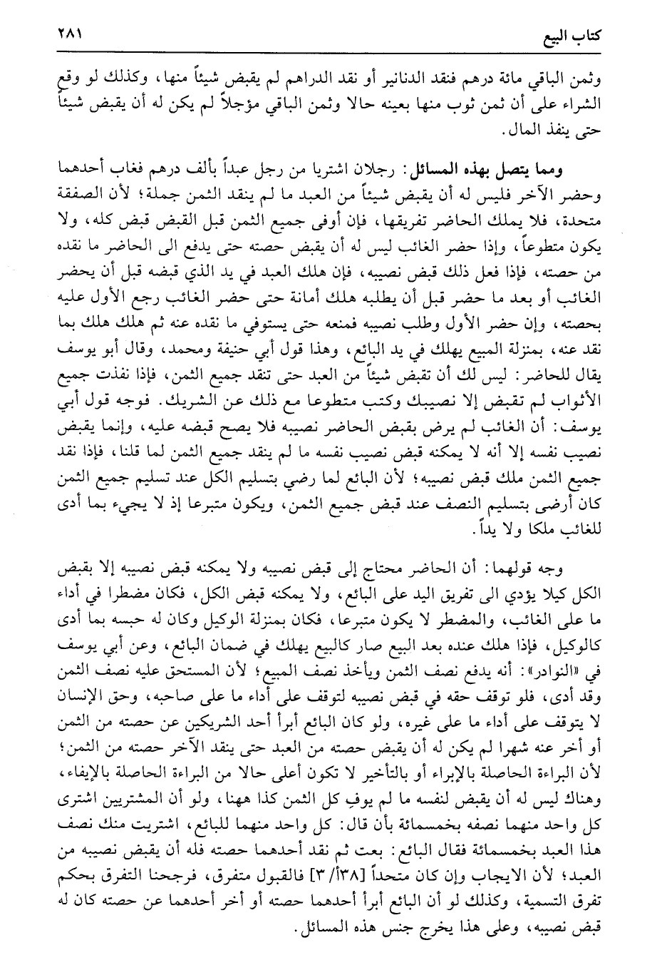 ومما يتصل بهذه المسائل: رجلان اشتريا من رجل عبداً بألف درهم فغاب أحدهما وحضر الآخر فليس له أن يقبض شيئاً من العبد ما لم ينقد الثمن جملة؛ لأن الصفقة متحدة، فلا يملك الحاضر تفريقها، فإن أوفى جميع الثمن قبل القبض قبض كله، ولا يكون متطوعاً، وإذا حضر الغائب ليس له أن يقبض حصته حتى يدفع الى الحاضر ما نقده من حصته، فإذا فعل ذلك قبض نصيبه، فإن هلك العبد في يد الذي قبضه قبل أن يحضر الغائب أو بعد ما حضر قبل أن يطلبه هلك أمانة حتى حضر الغائب رجع الأول عليه بحصته، وإن حضر الأول وطلب نصيبه فمنعه حتى يستوفي ما نقده عنه ثم هلك هلك بما نقد عنه، بمنزلة المبيع يهلك في يد البائع، وهذا قول أبي حنيفة ومحمد، وقال أبو يوسف يقال للحاضر: ليس لك أن تقبض شيئاً من العبد حتى تنقد جميع الثمن، فإذا نفذت جميع الأثواب لم تقبض إلا نصيبك وكتب متطوعا مع ذلك عن الشريك.o