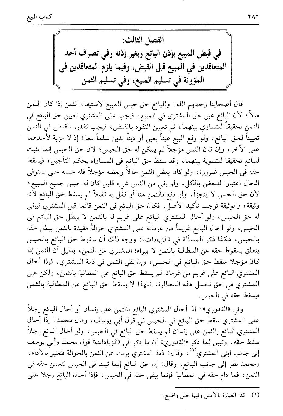 الفصل الثالث: في قبض المبيع بإذن البائع وبغير إذنه في تصرف أحد المتعاقدين في المبيع قبل القبض، وفيما يلزم المتعاقدين في المؤونة في تسليم المبيع، وفي تسليم الثمن