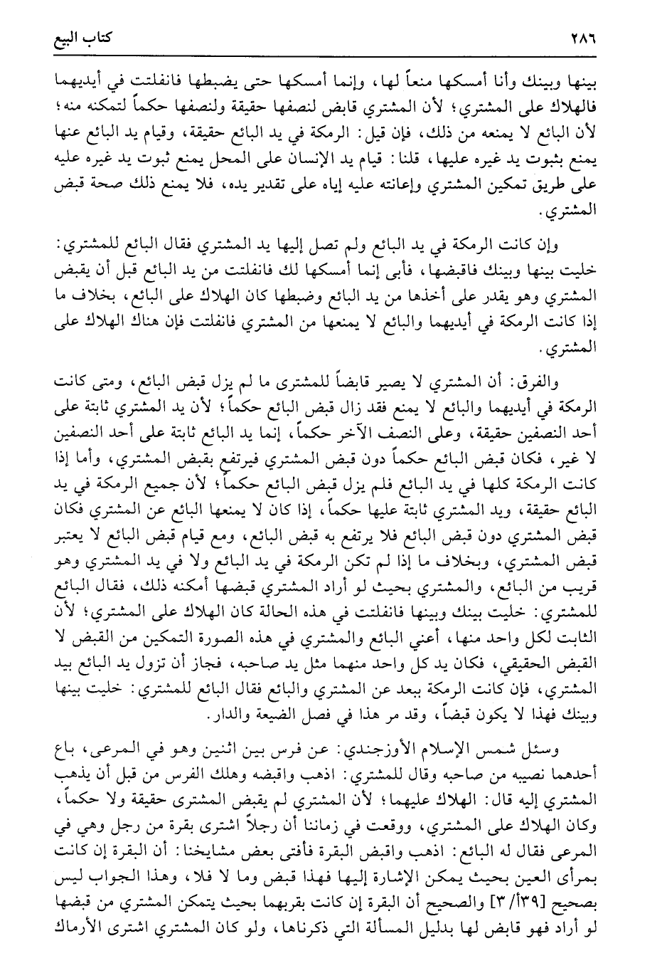 وسئل شمس الإسلام الأوزجندي: عن فرس بين اثنين وهو في المرعى، باع أحدهما نصيبه من صاحبه وقال للمشتري: اذهب واقبضه وهلك الفرس من قبل أن يذهب المشتري إليه قال: الهلاك عليهما؛ لأن المشتري لم يقبض المشترى حقيقة ولا حكماً، وكان الهلاك على المشتري، ووقعت في زماننا أن رجلاً اشترى بقرة من رجل وهي في المرعى فقال له البائع: اذهب واقبض البقرة فأفتى بعض مشايخنا: أن البقرة إن كانت بمرأى العين بحيث يمكن الإشارة إليها فهذا قبض وما لا فلا، وهذا الجواب ليس بصحيح (39أ3) والصحيح أن البقرة إن كانت بقربهما بحيث يتمكن المشتري من قبضها لو أراد فهو قابض لها بدليل المسألة التي ذكرناها، ولو كان المشتري اشترى الأرماك