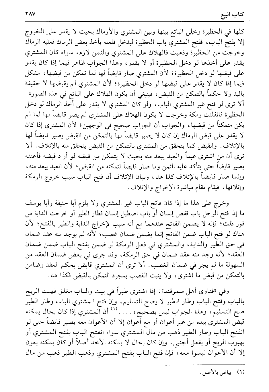 وفي «فتاوي أهل سمرقند» : إذا اشترى طيراً في بيت والباب مغلق فهبت الريح بالباب وفتح الباب وطار الطير لا يصح التسليم، وإن فتح المشتري الباب وطار الطير صح التسليم، وهذا الجواب ليس بصحيح،...... أن المشتري إذا كان بحال يمكنه قبض المشترى بيده من غير أعوان أو مع أعوان إلا أن الأعوان معه يصير قابضاً حتى لو انفتح الباب وطار الطير ذهب من مال المشتري سواء انفتح الباب بفتح المشتري أو بهبوب الريح أو بفعل أجنبي، وإن كان بحال لا يمكنه الأخذ أصلاً أو كان يمكنه بعون إلا أن الأعوان ليسوا معه، فإن فتح الباب بفتح المشتري وذهب الطير ذهب من مال