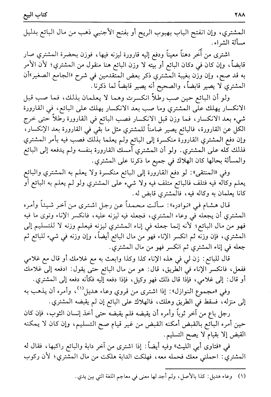 ولو أن البائع حين صب رطلاً انكسرت وهما لا يعلمان بذلك، فما صب قبل الانكسار يهلك على المشتري وما صب بعد الانكسار يهلك على البائع، في القارورة شيء بعد الانكسار، فما وزن قبل الانكسار فصب البائع في القارورة رطلاً حتى خرج الكل عن القارورة، فالبائع يصير ضامناً للمشتري مثل ما بقي في القارورة بعد الإنكسار، وإن دفع المشتري القارورة منكسرة إلى البائع ولم يعلما بذلك فصب فيه بأمر المشتري فذلك كله على المشتري.m