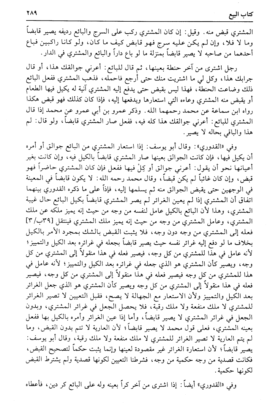 وفي «القدوري» : وقال أبو يوسف: إذا استعار المشتري من البائع جوالق أو أمره أن يكيل فيها، فإن كانت الجوالق بعينها صار المشتري قابضاً بالكيل فيه، وإن كانت بغير أعيانها نحو أن يقول: أعرني جوالق أو كِلْ فيها ففعل فإن كان المشتري حاضراً فهو قبض، وإن كان غائباً لم يكن قبضاً، وقال محمد رحمه الله: لا يكون قابضاً في المعينة في الوجهين حتى يقبض الجوالق منه ثم يسلمها إليه، فإذاً على ما ذكره القدوري بينهما اتفاق أن المشتري إذا لم يعين الغرائر لم يصر المشتري قابضاً بكيل البائع حال غيبة المشتري، وهذا لأن البائع بالكيل عامل لنفسه من وجه من حيث إنه يميز ملكه عن ملك المشتري، وعامل المشتري من وجه من حيث إنه يميز ملك المشتري فينتقل (39ب3) فعله إلى المشتري من وجه دون وجه، فلا يثبت القبض بالشك بمجرد الأمر بالكيل بخلاف ما لو دفع إليه غرائر نفسه حيث يصير قابضاً بجعله في غرائره بعد الكيل والتمييز؛ لأنه عامل في هذا للمشتري من كل وجه، فيصير فعله في هذا منقولاً إلى المشتري من كل وجه، ويصير كأن المشتري هو الذي جعله في غرائره بعد الكيل والتمييز؛ لأنه عامل في هذا للمشتري من كل وجه فيصير فعله في هذا منقولاً إلى المشتري من كل وجه، فيصير فعله في هذا منقولاً إلى المشتري من كل (وجه) ويصير كأن المشتري هو الذي جعل الغرائر بعد الكيل والتمييز ولأن الاستعار مع الجهالة لا يصح، فقبل التعيين لا تصير الغرائر للمشتري لا ملك منفعة ولا ملك رقبة، فلا يحصل الجعل في غرائر المشتري، وبدون الجعل في غرائر المشتري (لا يصير) قابضاً، وأما إذا عين الغرائر وأمره بالكيل بها ففعل بعينه المشتري، فعلى قول محمد لا يصير قابضاً؛ لأن العارية لا تتم بدون القبض، وما لم يتم العارية لا تصير الغرائر للمشتري لا ملك منفعة ولا ملك رقبة، وقال أبو يوسف: يصير قابضاً؛ لأن استعارة الغرائر غير مقصودة لعينها وإنما يثبت حكماً لتصحيح القبض، فكانت قصدية من