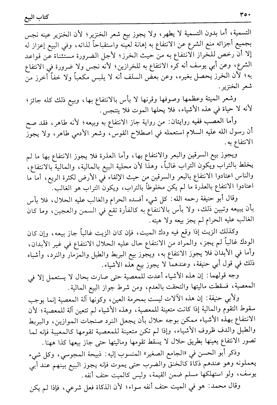 ويجوز بيع السرقين والبعر والانتفاع بها، وأما العذرة فلا يجوز الانتفاع بها ما لم يخلط بالتراب ويكون التراب غالبا، وهذا لأن محلية البيع بالمالية، والمالية بالانتفاع، والناس اعتادوا الانتفاع بالبعر والسرقين من حيث الإلقاء في الأرض لكثرة الريع، أما ما اعتادوا الانتفاع بالعذرة ما لم يكن مخلوطاً بالتراب، ويكون التراب هو الغالب.