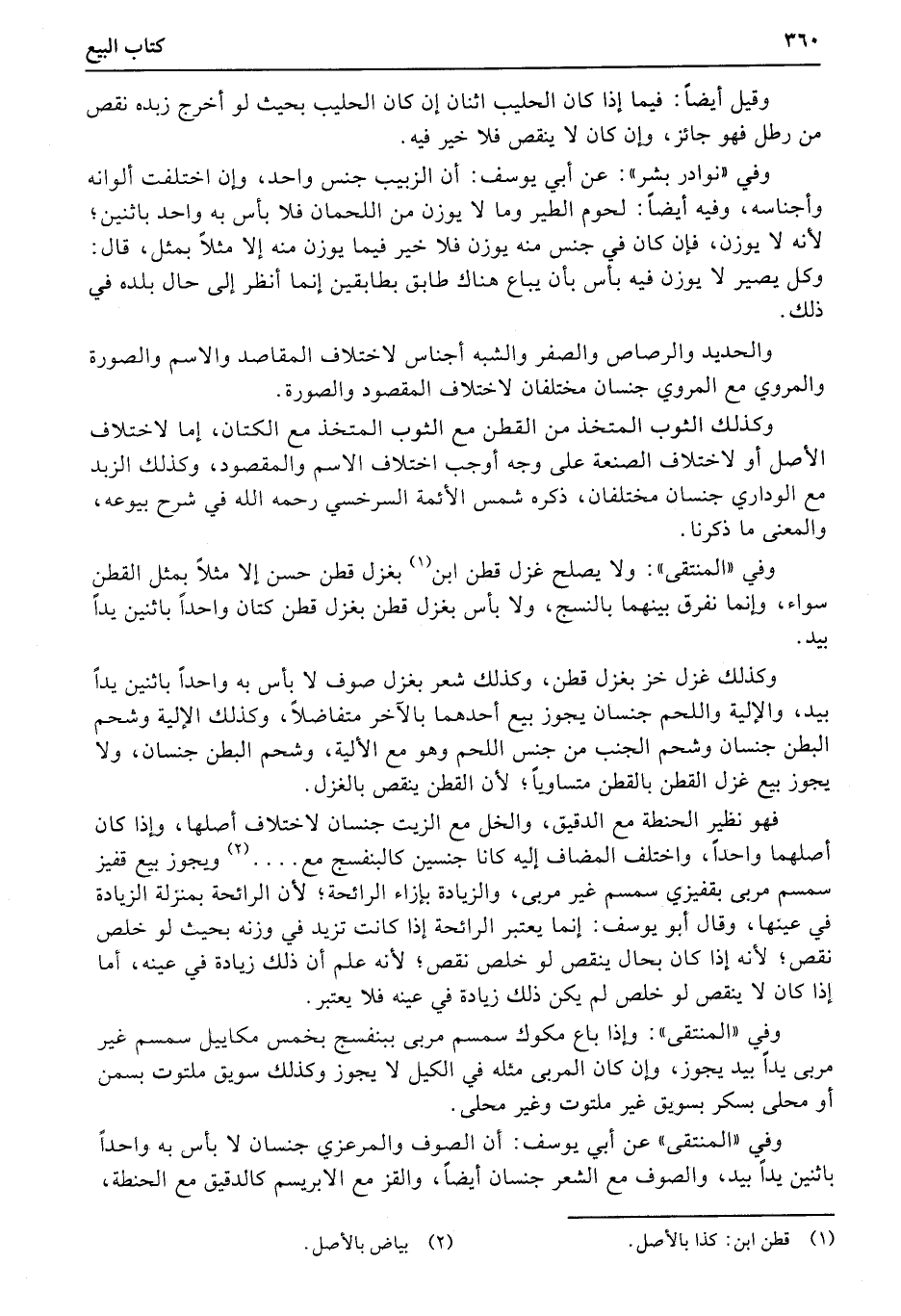 وكذلك غزل خز بغزل قطن، وكذلك شعر بغزل صوف لا بأس به واحداً باثنين يداً بيد، والإلية واللحم جنسان يجوز بيع أحدهما بالآخر متفاضلاً، وكذلك الإلية وشحم البطن جنسان وشحم الجنب من جنس اللحم وهو مع الألية، وشحم البطن جنسان، ولا يجوز بيع غزل القطن بالقطن متساوياً؛ لأن القطن ينقص بالغزل.