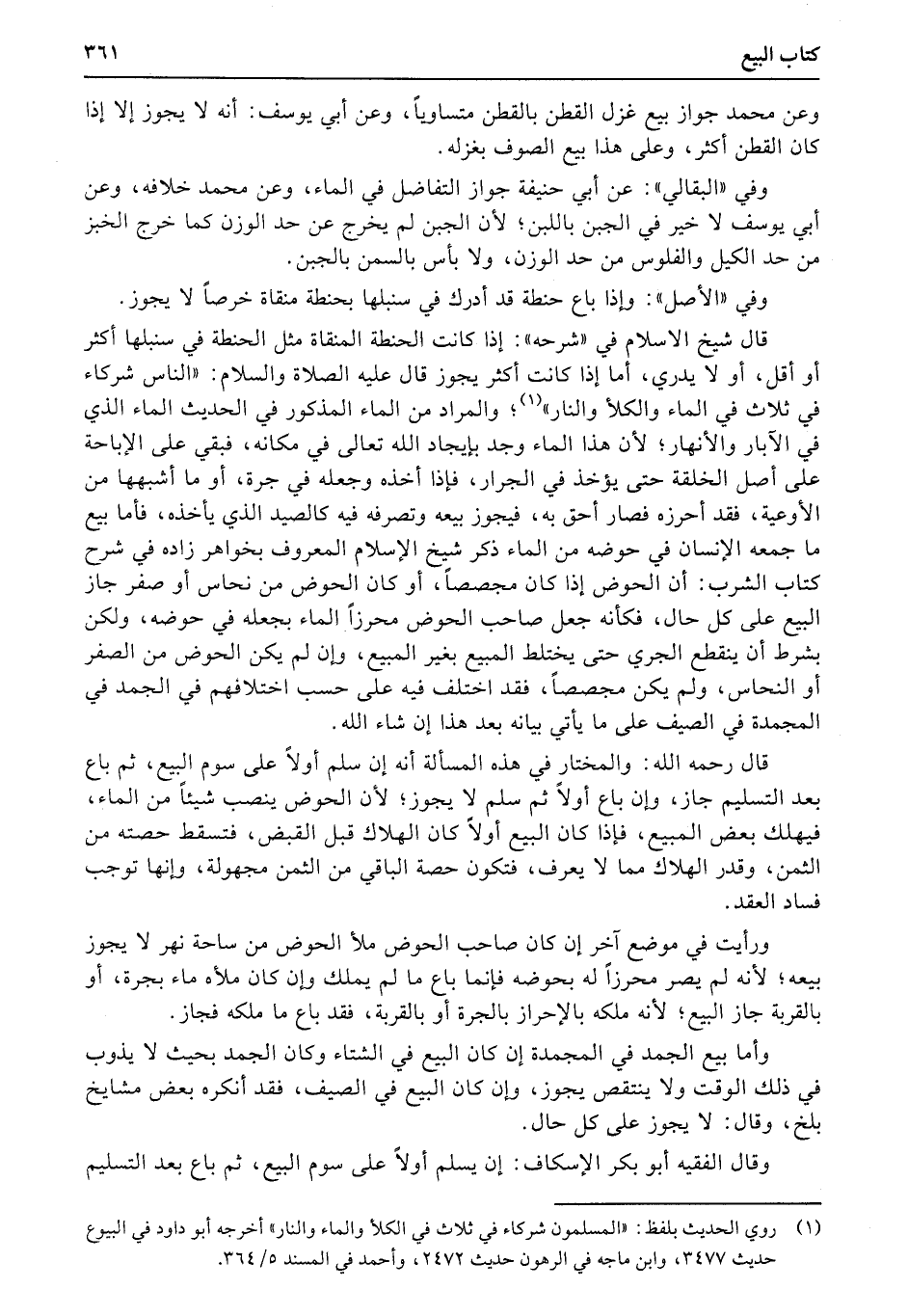 قال شيخ الاسلام في «شرحه» : إذا كانت الحنطة المنقاة مثل الحنطة في سنبلها أكثر أو أقل، أو لا يدري، أما إذا كانت أكثر يجوز قال عليه الصلاة والسلام: «الناس شركاء في ثلاث في الماء والكلأ والنار» ؛ والمراد من الماء المذكور في الحديث الماء الذي في الآبار والأنهار؛ لأن هذا الماء وجد بإيجاد الله تعالى في مكانه، فبقي على الإباحة على أصل الخلقة حتى يؤخذ في الجرار، فإذا أخذه وجعله في جرة، أو ما أشبهها من الأوعية، فقد أحرزه فصار أحق به، فيجوز بيعه وتصرفه فيه كالصيد الذي يأخذه، فأما بيع ما جمعه الإنسان في حوضه من الماء ذكر شيخ الإسلام المعروف بخواهر زاده في شرح كتاب الشرب: أن الحوض إذا كان مجصصاً، أو كان الحوض من نحاس أو صفر جاز البيع على كل حال، فكأنه جعل صاحب الحوض محرزاً الماء بجعله في حوضه، ولكن بشرط أن ينقطع الجري حتى يختلط المبيع بغير المبيع، وإن لم يكن الحوض من الصفر أو النحاس، ولم يكن مجصصاً، فقد اختلف فيه على حسب اختلافهم في الجمد في المجمدة في الصيف على ما يأتي بيانه بعد هذا إن شاء الله.