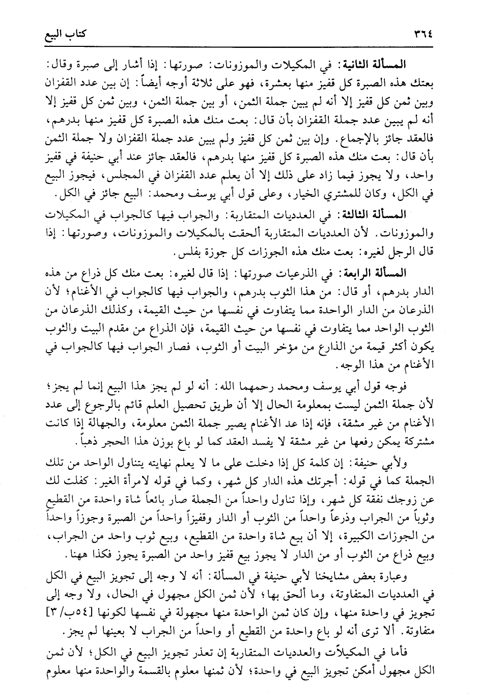 المسألة الثانية: في المكيلاًت والموزونات: صورتها: إذا أشار إلى صبرة وقال: بعتك هذه الصبرة كل قفيز منها بعشرة، فهو على ثلاثة أوجه أيضاً: إن بين عدد القفزان وبين ثمن كل قفيز إلا أنه لم يبين جملة الثمن، أو بين جملة الثمن، وبين ثمن كل قفيز إلا أنه لم يبين عدد جملة القفزان بأن قال: بعت منك هذه الصبرة كل قفيز منها بدرهم، فالعقد جائز بالإجماع.
