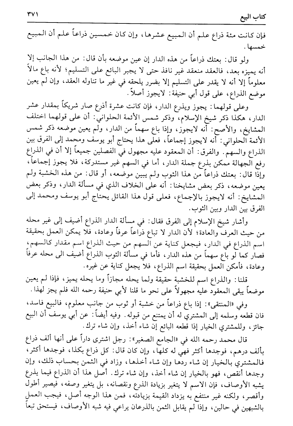 وأشار شيخ الإسلام إلى الفرق فقال: في مسألة الدار الذراع أضيف إلى غير محله من حيث العرف والعادة؛ لأن الدار لاباع ذراعاً عرفاً وعادة، فلا يمكن العمل بحقيقة اسم الذراع في الدار، فيجعل كناية عن السهم من حيث الذراع اسم مقدار كالسهم، فصار كما لو باع سهماً من هذه الدار، فأما في مسألة الثوب الذراع أضيف الى محله عرفاً وعادة، فأمكن العمل بحقيقة اسم الذراع، فلا يجعل كناية عن غيره.
