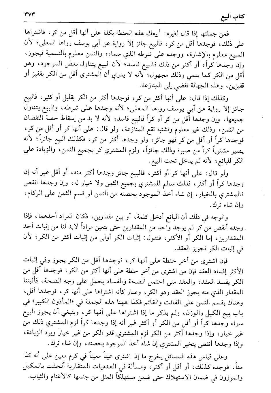 فإن اشترى من أخر حنطة على أنها كر، فوجدها أقل من الكر يجوز وفي إثبات الأكثر إفساد العقد فإن من اشترى من آخر حنطة على أنها أكثر من الكر، فوجدها أقل من الكر يفسد العقد، والعقد متى احتمل الصحة والفساد يحمل على وجه الصحة، فأثبتنا المقدار الذي منه يجوز العقد وهو الكر، وصار كأنه اشتراها على أنها كر، فوجدها أقل، وهناك يقسم الثمن على الفائت والقائم فكذا ههنا هذه الجملة في «المأذون الكبير» في باب بيع الكيل والوزن، ولم يذكر ما إذا اشتراها على أنها كر، وينبغي أن يجوز البيع سواء وجدها كراً أو أقل من الكر أو أكثر غير أنه إذا وجدها كراً لزم المشتري ذلك من غير خيار، وإذا وجدها أكثر من الكر لزم المشتري قدر الكر من غير خيار ويرد الزيادة، وإذا وجدها أنقص يتخير المشتري إن شاء أخذ الموجود بحصته، وإن شاء ترك.