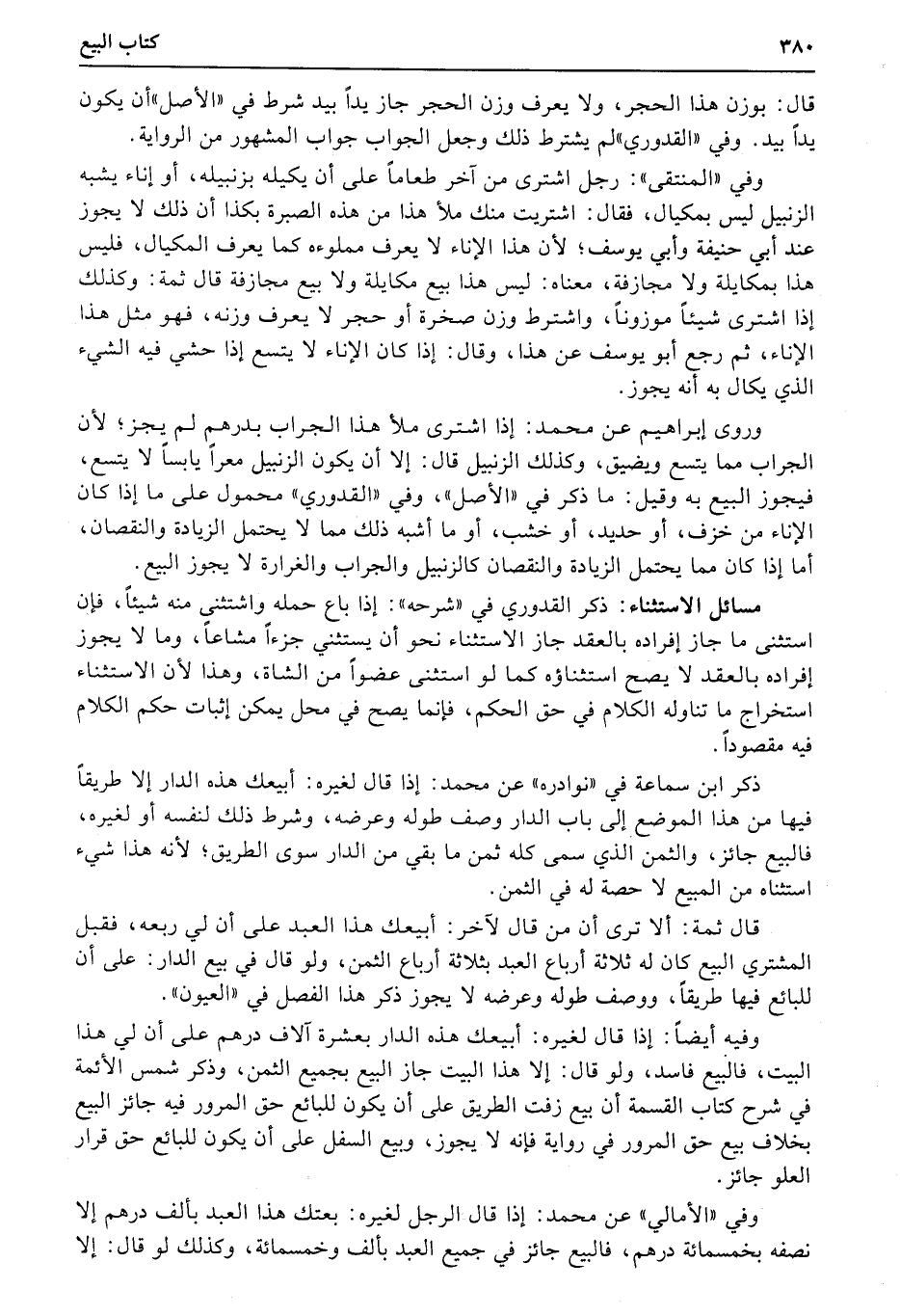 وروى إبراهيم عن محمد: إذا اشترى ملأ هذا الجراب بدرهم لم يجز؛ لأن الجراب مما يتسع ويضيق، وكذلك الزنبيل قال: إلا أن يكون الزنبيل معراً يابساً لا يتسع، فيجوز البيع به وقيل: ما ذكر في «الأصل» ، وفي «القدوري» محمول على ما إذا كان الإناء من خزف، أو حديد، أو خشب، أو ما أشبه ذلك مما لا يحتمل الزيادة والنقصان، أما إذا كان مما يحتمل الزيادة والنقصان كالزنبيل والجراب والغرارة لا يجوز البيع.m