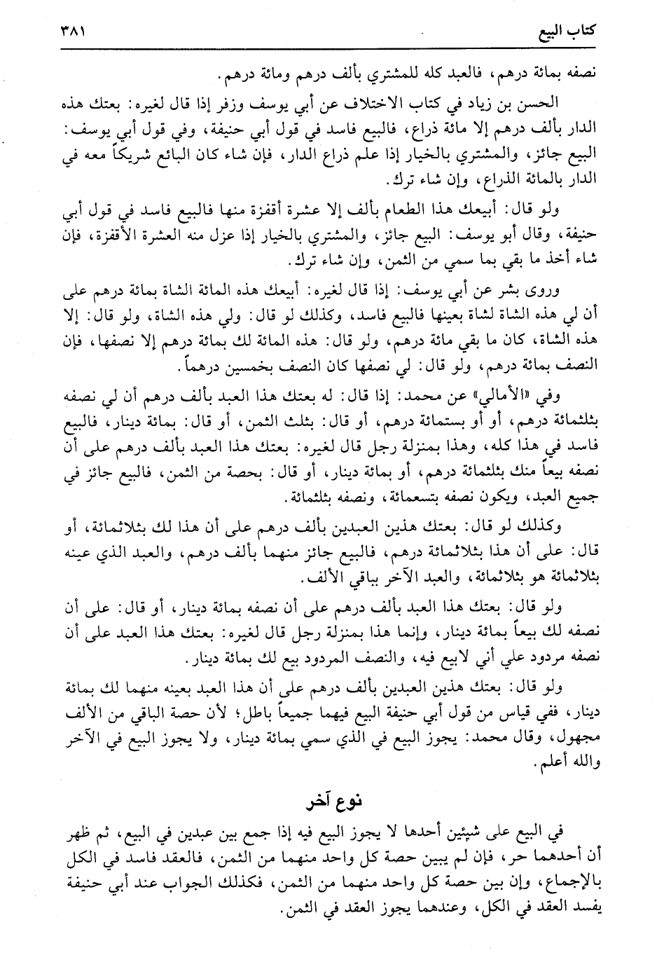 في البيع على شيئين أحدها لا يجوز البيع فيه إذا جمع بين عبدين في البيع، ثم ظهر أن أحدهما حر، فإن لم يبين حصة كل واحد منهما من الثمن، فالعقد فاسد في الكل بالإجماع، وإن بين حصة كل واحد منهما من الثمن، فكذلك الجواب عند أبي حنيفة يفسد العقد في الكل، وعندهما يجوز العقد في الثمن.