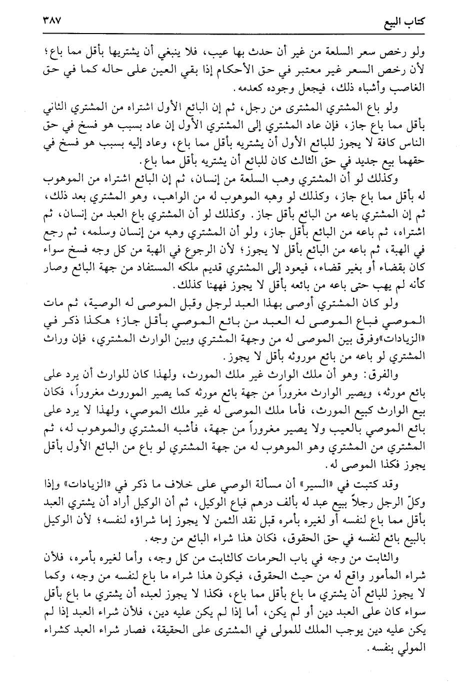 ولو باع المشتري المشترى من رجل، ثم إن البائع الأول اشتراه من المشتري الثاني بأقل مما باع جاز، فإن عاد المشتري إلى المشتري الأول إن عاد بسبب هو فسخ في حق الناس كافة لا يجوز للبائع الأول أن يشتريه بأقل مما باع، وعاد إليه بسبب هو فسخ في حقهما بيع جديد في حق الثالث كان للبائع أن يشتريه بأقل مما باع.