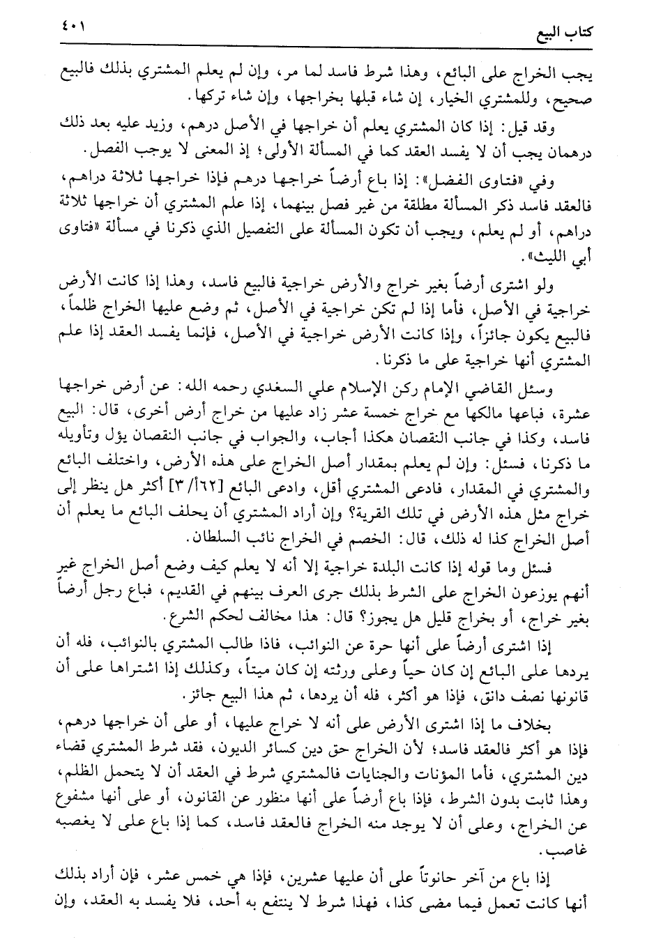 فسئل وما قوله إذا كانت البلدة خراجية إلا أنه لا يعلم كيف وضع أصل الخراج غير أنهم يوزعون الخراج على الشرب بذلك جرى العرف بينهم في القديم، فباع رجل أرضاً بغير خراج، أو بخراج قليل هل يجوز؟ قال: هذا مخالف لحكم الشرع.