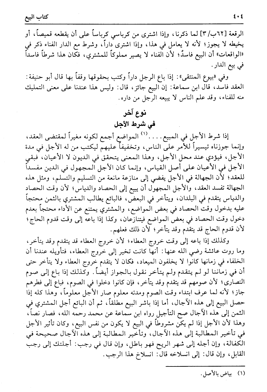 إذا شرط الأجل في المبيع.... المواضع أجمع لكونه مغيراً لمقتضى العقد، وإنما جوزناه تيسيراً للأمر على الناس، وتخفيفاً عليهم ليكتب من له الأجل في مدة الأجل، فيؤدي عند محل الأجل، وهذا المعنى يتحقق في الديون لا الأعيان، فبقي الأجل في الأعيان على أصل القياس، وإنما كان الأجل المجهول في الدين مفسداً للعقد؛ لأن الجهالة في الأجل يفضي إلى منازعة مانعة من التسليم والتسلم، ومثل هذه الجهالة تفسد العقد، والأجل المجهول أن يبيع إلى الحصاد والدياس؛ لأن وقت الحصاد والدياس يتقدم في البلدان، ويتأخر في البعض، فالبائع يطالب المشتري بالثمن محتجاً عليه بدخول وقت الحصاد في بعض المواضع، والمشتري يمتنع عن الأداء محتجاً بعدم دخول وقت الحصاد في بعض المواضع فيتنازعان، وكذا إذا باعه إلى وقت قدوم الحاج؛ لأن قدوم الحاج قد يتقدم وقد يتأخر؛ لأن ذلك فعلهم.