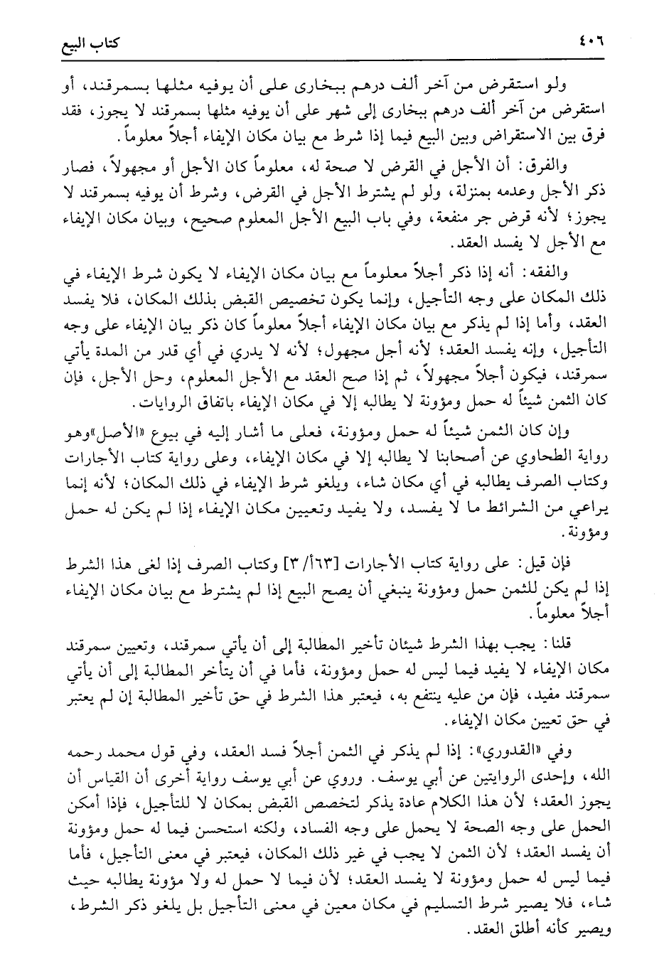قلنا: يجب بهذا الشرط شيئان تأخير المطالبة إلى أن يأتي سمرقند، وتعيين سمرقند مكان الإيفاء لا يفيد فيما ليس له حمل ومؤونة، فأما في أن يتأخر المطالبة إلى أن يأتي سمرقند مفيد، فإن من عليه ينتفع به، فيعتبر هذا الشرط في حق تأخير المطالبة إن لم يعتبر في حق تعيين مكان الإيفاء.