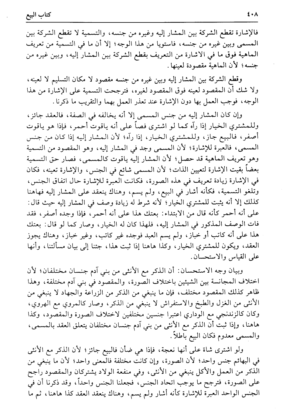 وقطع الشركة بين المشار إليه وبين غيره من جنسه مقصود لا مكان التسليم لا لعينه، ولا شك أن المقصود لعينه فوق المقصود لغيره، فترجحت التسمية على الإشارة من هذا الوجه، فوجب العمل بها دون الإشارة عند تعذر العمل بهما والتقريب ما ذكرنا.