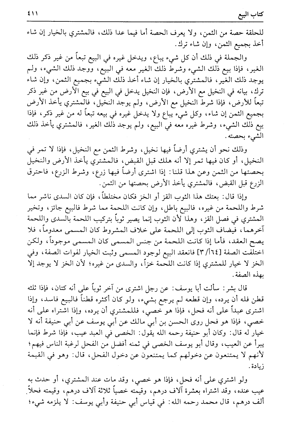 قال بشر: سألت أبا يوسف: عن رجل اشترى من آخر ثوباً على أنه كتان، فإذا ثلثه قطن فله أن يرده، وإن قطعه لم يرجع بشيء، ولو كان أكثره قطناً فالبيع فاسد، وإذا اشترى عبداً على أنه فحل، فإذا هو خصي، فللمشتري أن يرده، وإذا اشتراه على أنه خصي، فإذا هو فحل روى الحسن ابن أبي مالك عن أبي يوسف عن أبي حنيفة أنه لا خيار له قال: وكان أبو حنيفة رحمه الله يقول: الخصى في العبد عيب، فإذا شرط فإنما يبرأ عن العيب، وقال أبو يوسف الخصى في ثمنه أفضل من الفحل لرغبة الناس فيهم؛ لأنهم لا يمتنعون عن دخولهم كما يمتنعون عن دخول الفحل، قال: وهو في القيمة زيادة.