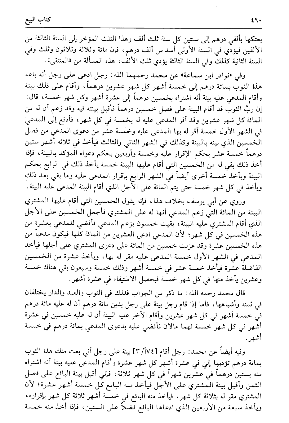 قال محمد رحمه الله: ما ذكر من الجواب فذلك في الثوب والعبد والدار يختلفان في ثمنه وأشباهها، فأما إذا قام رجل بينة على رجل بدين مائة درهم أن له عليه مائة درهم في خمسة أشهر في كل شهر عشرين وأقام الأخر عليه البينة أن له عليه خمسين في عشرة أشهر في كل شهر خمسة فهما مالان فأقضي عليه بدعوى المدعي بمائة درهم في خمسة أشهر.