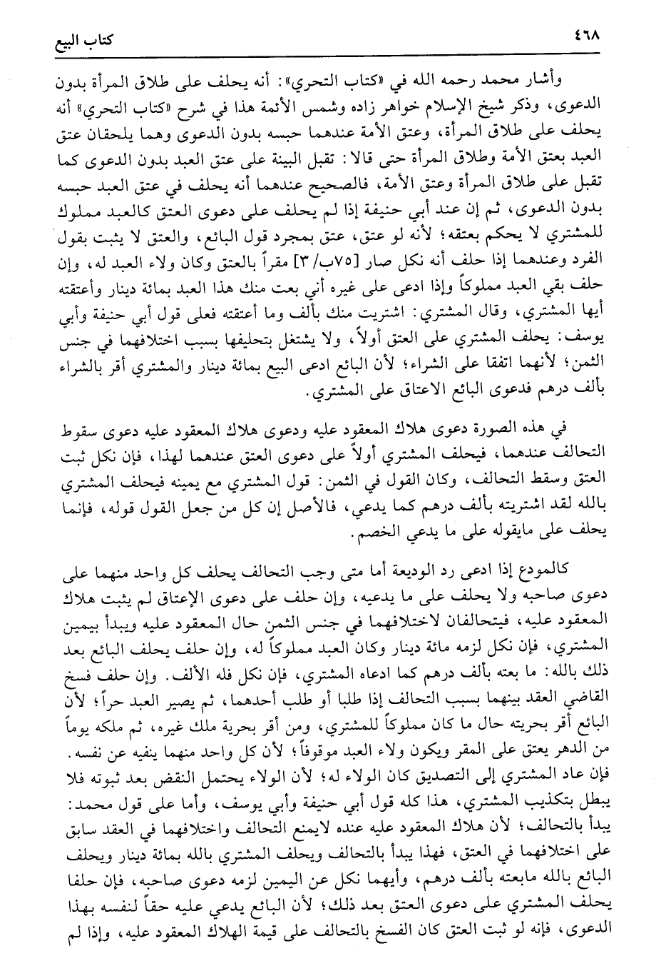 وأشار محمد رحمه الله في «كتاب التحري» : أنه يحلف على طلاق المرأة بدون الدعوى، وذكر شيخ الإسلام خواهرزاده وشمس الأئمة هذا في شرح «كتاب التحري» أنه يحلف على طلاق المرأة، وعتق الأمة عندهما حبسه بدون الدعوى وهما يلحقان عتق العبد بعتق الأمة وطلاق المرأة حتى قالا: تقبل البينة على عتق العبد بدون الدعوى كما تقبل على طلاق المرأة وعتق الأمة، فالصحيح عندهما أنه يحلف في عتق العبد حبسه بدون الدعوى، ثم إن عند أبي حنيفة إذا لم يحلف على دعوى العتق كالعبد مملوك للمشتري لا يحكم بعتقه؛ لأنه لو عتق، عتق بمجرد قول البائع، والعتق لا يثبت بقول الفرد وعندهما إذا حلف أنه نكل صار (75ب3) مقراً بالعتق وكان ولاء العبد له، وإن حلف بقي العبد مملوكاً وإذا ادعى على غيره أني بعت منك هذا العبد بمائة دينار وأعتقته أيها المشتري، وقال المشتري: اشتريت منك بألف وما أعتقته فعلى قول أبي حنيفة وأبي يوسف: يحلف المشتري على العتق أولاً، ولا يشتغل بتحليفها بسبب اختلافهما في جنس الثمن؛ لأنهما اتفقا على الشراء؛ لأن البائع ادعى البيع بمائة دينار والمشتري أقر بالشراء بألف درهم فدعوى البائع الاعتاق على المشتري.