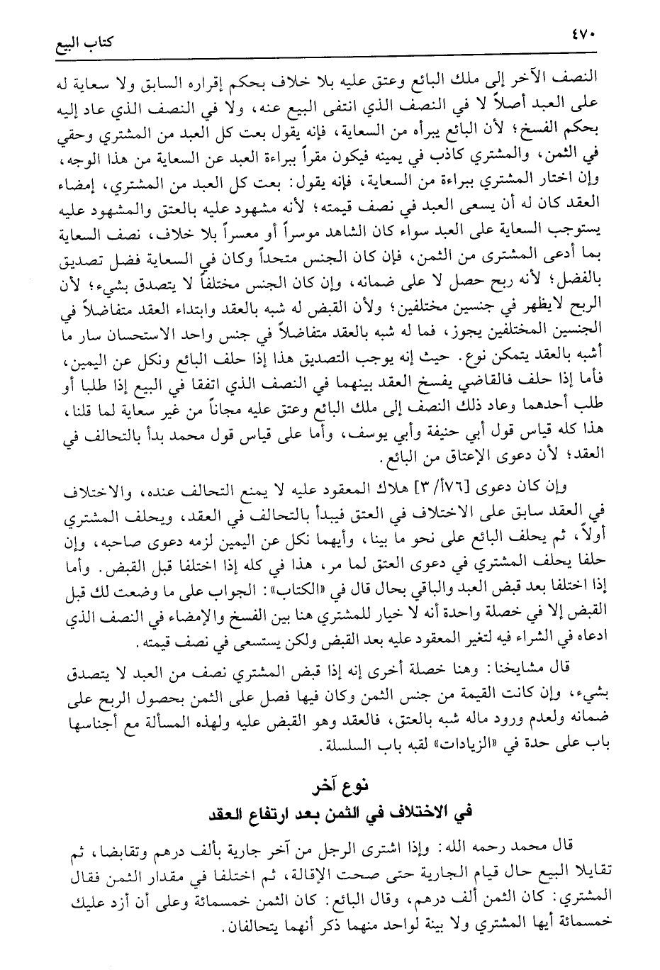 النصف الآخر إلى ملك البائع وعتق عليه بلا خلاف بحكم إقراره السابق ولا سعاية له على العبد أصلاً لا في النصف الذي انتفى البيع عنه، ولا في النصف الذي عاد إليه بحكم الفسخ؛ لأن البائع يبرأه من السعاية، فإنه يقول بعت كل العبد من المشتري وحقي في الثمن، والمشتري كاذب في يمينه فيكون مقراً ببراءة العبد عن السعاية من هذا الوجه، وإن اختار المشتري ببراءة من السعاية، فإنه يقول: بعت كل العبد من المشتري، إمضاء العقد كان له أن يسعى العبد في نصف قيمته؛ لأنه مشهود عليه بالعتق والمشهود عليه يستوجب السعاية على العبد سواء كان الشاهد موسراً أو معسراً بلا خلاف، نصف السعاية بما أدعى المشترى من الثمن، فإن كان الجنس متحداً وكان في السعاية فضل تصديق بالفضل؛ لأنه ربح حصل لا على ضمانه، وإن كان الجنس مختلفاً لا يتصدق بشيء؛ لأن الربح لايظهر في جنسين مختلفين؛ ولأن القبض له شبه بالعقد وابتداء العقد متفاضلاً في الجنسين المختلفين يجوز، فما له شبه بالعقد متفاضلاً في جنس واحد الاستحسان سار ما أشبه بالعقد يتمكن نوع.