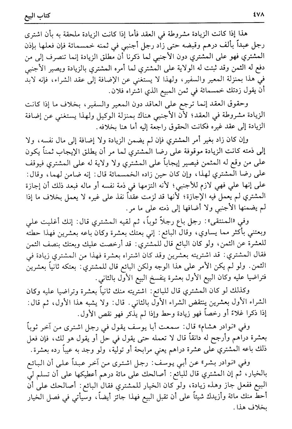 هذا إذا كانت الزيادة مشروطة في العقد فأما إذا كانت الزيادة ملحقة به بأن اشترى رجل عبداً بألف درهم وقبضه حتى زاد رجل أجنبي في ثمنه خمسمائة فإن فعلها بإذن المشتري فهو على المشتري دون الأجنبي لما ذكرنا أن مطلق الزيادة إنما تنصرف إلى من دفع له الثمن وقد ثبتت له الولاية على المشتري لما أمره المشتري بالزيادة ويصير الأجنبي في هذا بمنزلة المعير والسفير، ولهذا لا يستغني عن الإضافة إلى عقد الشراء، فإنه لابد أن يقول زدتك خمسمائة في ثمن المبيع الذي اشتراه فلان.