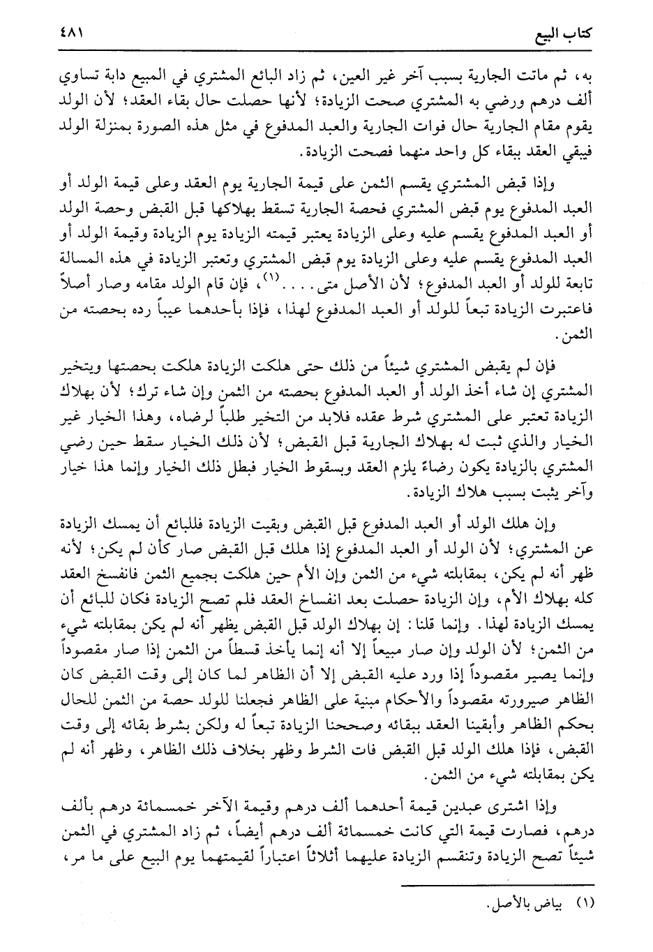 فإن لم يقبض المشتري شيئاً من ذلك حتى هلكت الزيادة هلكت بحصتها ويتخير المشتري إن شاء أخذ الولد أو العبد المدفوع بحصته من الثمن وإن شاء ترك؛ لأن بهلاك الزيادة تعتبر على المشتري شرط عقده فلابد من التخير طلباً لرضاه، وهذا الخيار غير الخيار والذي ثبت له بهلاك الجارية قبل القبض؛ لأن ذلك الخيار سقط حين رضي المشتري بالزيادة يكون رضاءً يلزم العقد وبسقوط الخيار فبطل ذلك الخيار وإنما هذا خيار وآخر يثبت بسبب هلاك الزيادة.