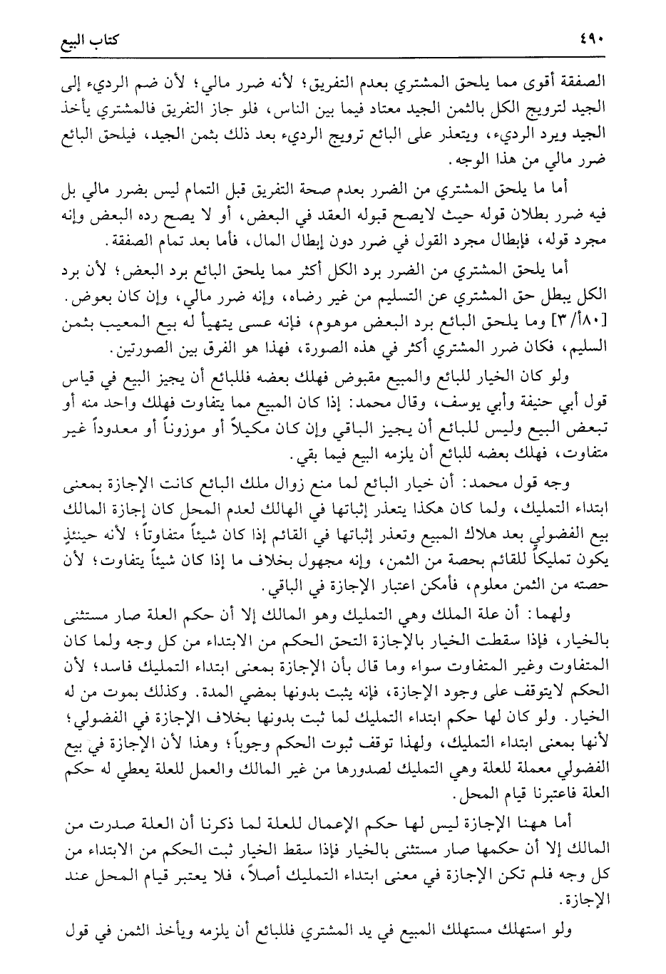 أما يلحق المشتري من الضرر برد الكل أكثر مما يلحق البائع برد البعض؛ لأن برد الكل يبطل حق المشتري عن التسليم من غير رضاه، وإنه ضرر مالي، وإن كان بعوض. (80أ3) وما يلحق البائع برد البعض موهوم، فإنه عسى يتهيأ له بيع المعيب بثمن السليم، فكان ضرر المشتري أكثر في هذه الصورة، فهذا هو الفرق بين الصورتين.